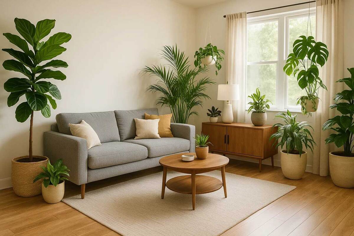 Объединяя разные виды с похожими условиями ухода, облегчите себе заботу. Например, чтобы три растения требовали обильного полива, просто предоставьте им одну систему ухода. Экспериментируйте с текстурами и формами растений, ведь именно они через разнообразие добавляют вашей гостиной шарма и глубины.