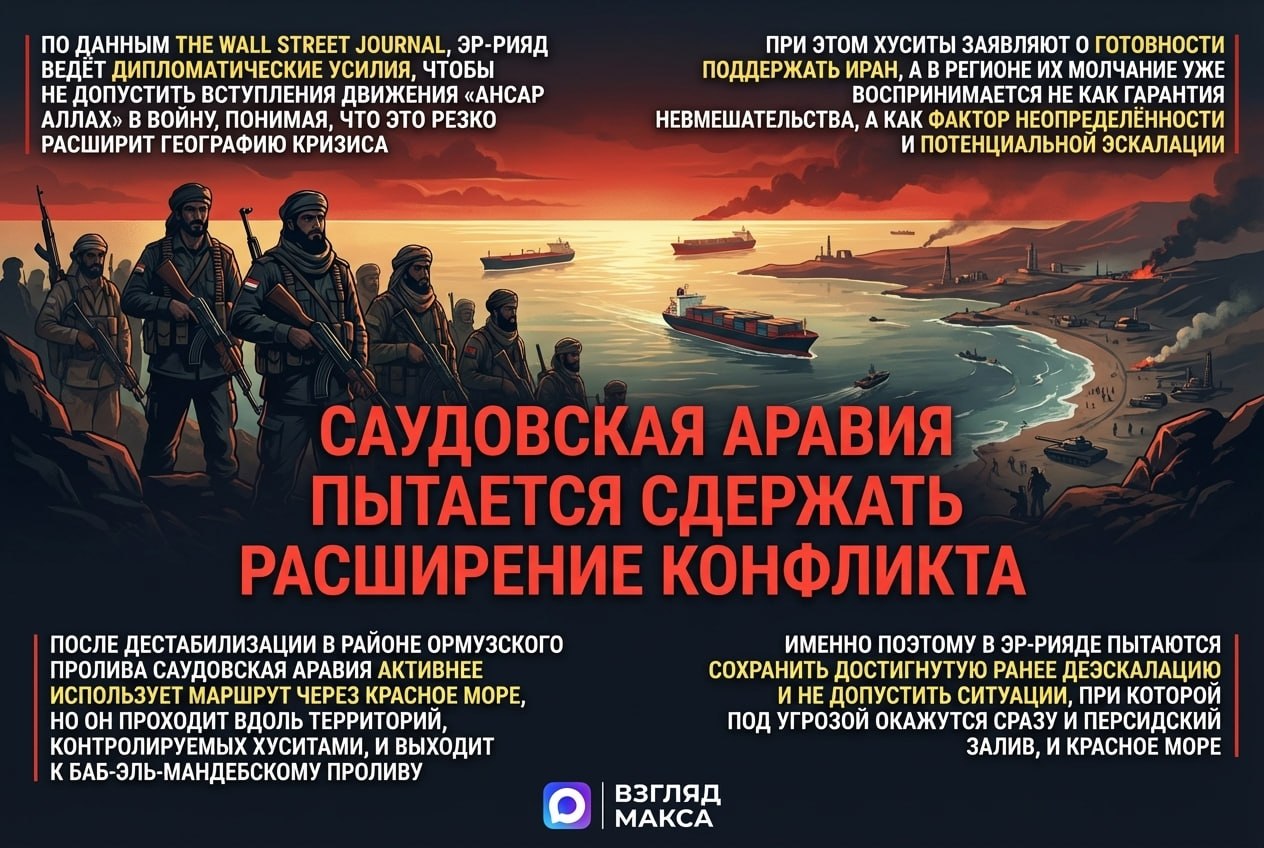 Саудовская сторона, как следует из публикации, сейчас опирается на достигнутую ещё в 2022 году договорённость с хуситами, по которой стороны обязались не атаковать территорию и суда друг друга. После многих лет войны Эр-Рияд пошёл на деэскалацию именно затем, чтобы снизить риск новых ударов со стороны движения. Теперь задача саудовской дипломатии — не дать этой конструкции окончательно рассыпаться на фоне войны вокруг Ирана.