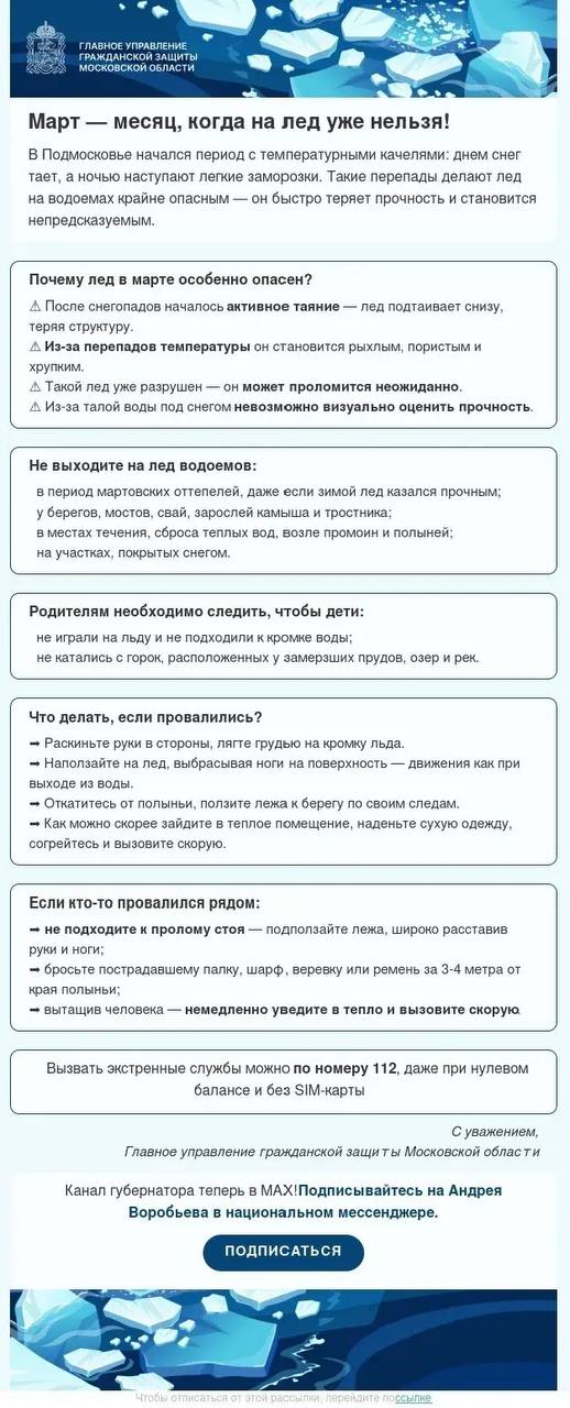 Уважаемые жители и гости г.о. Люберцы, будьте осторожны и внимательны – весной лед становится тоньше и ломается без треска.