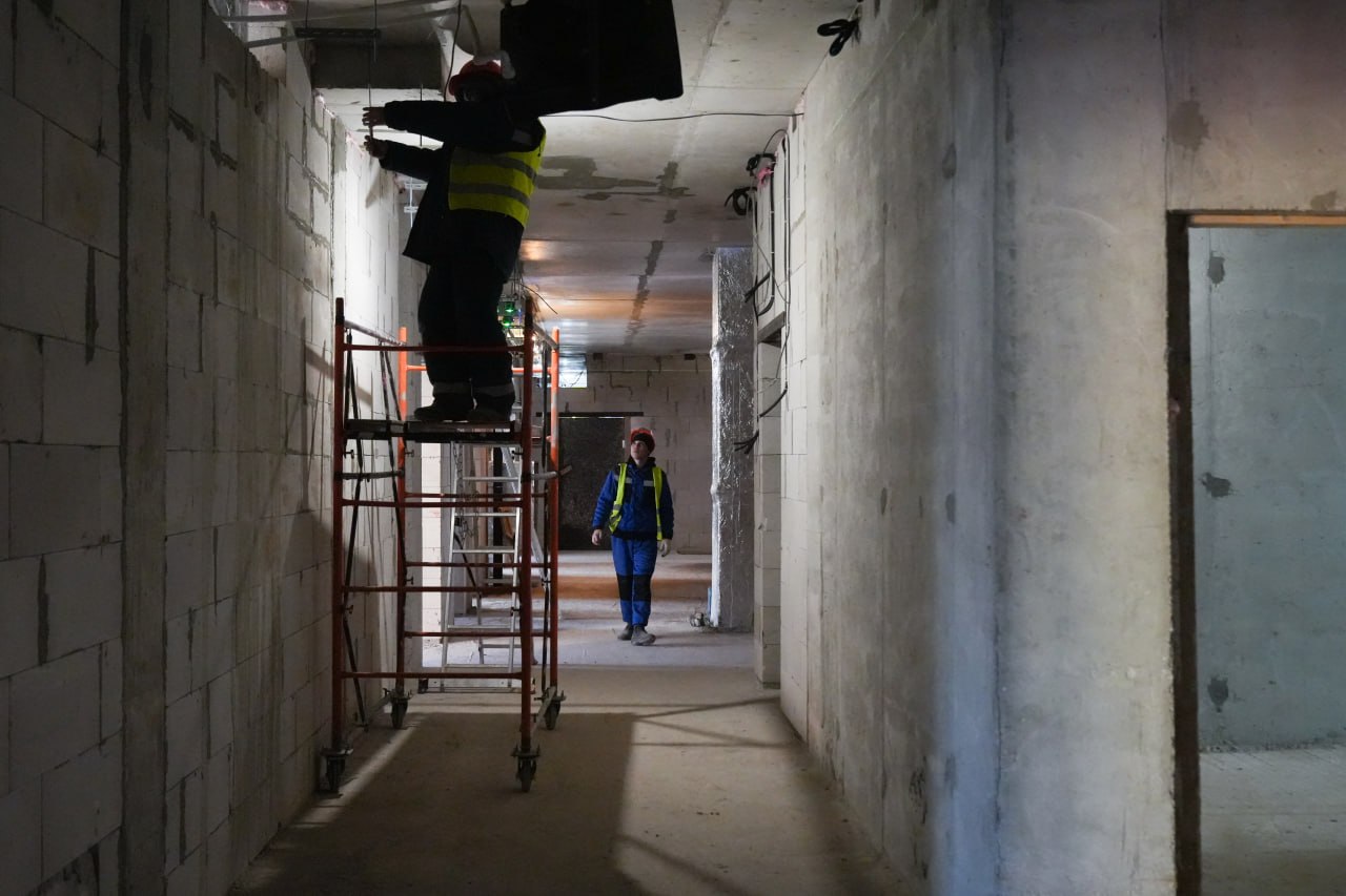 Сейчас рабочие занимаются внутренней отделкой, коммуникациями, завершают работы на фасаде и кровле. Общая готовность — 64%. В планах сдать объект уже в этом году.
