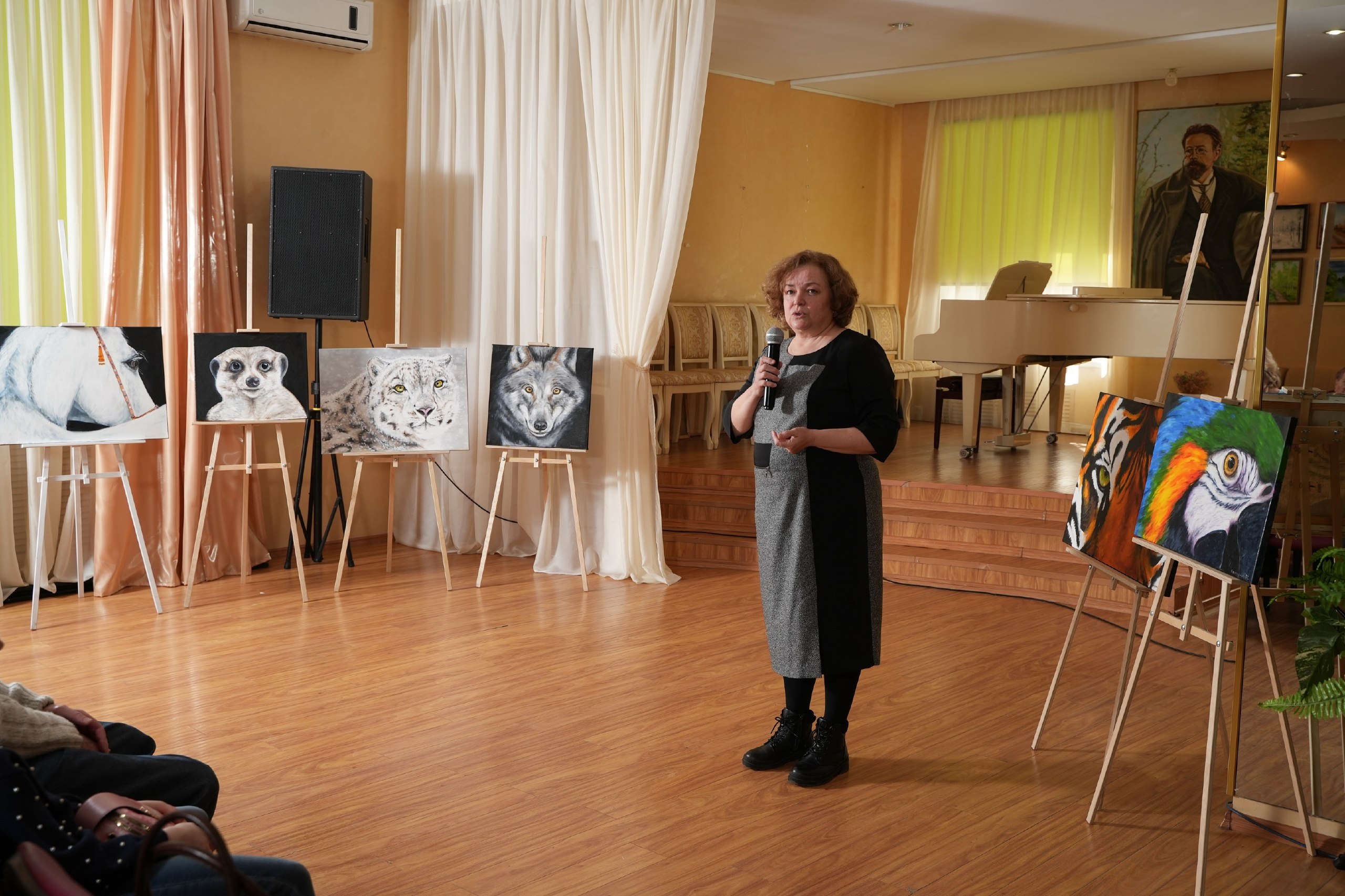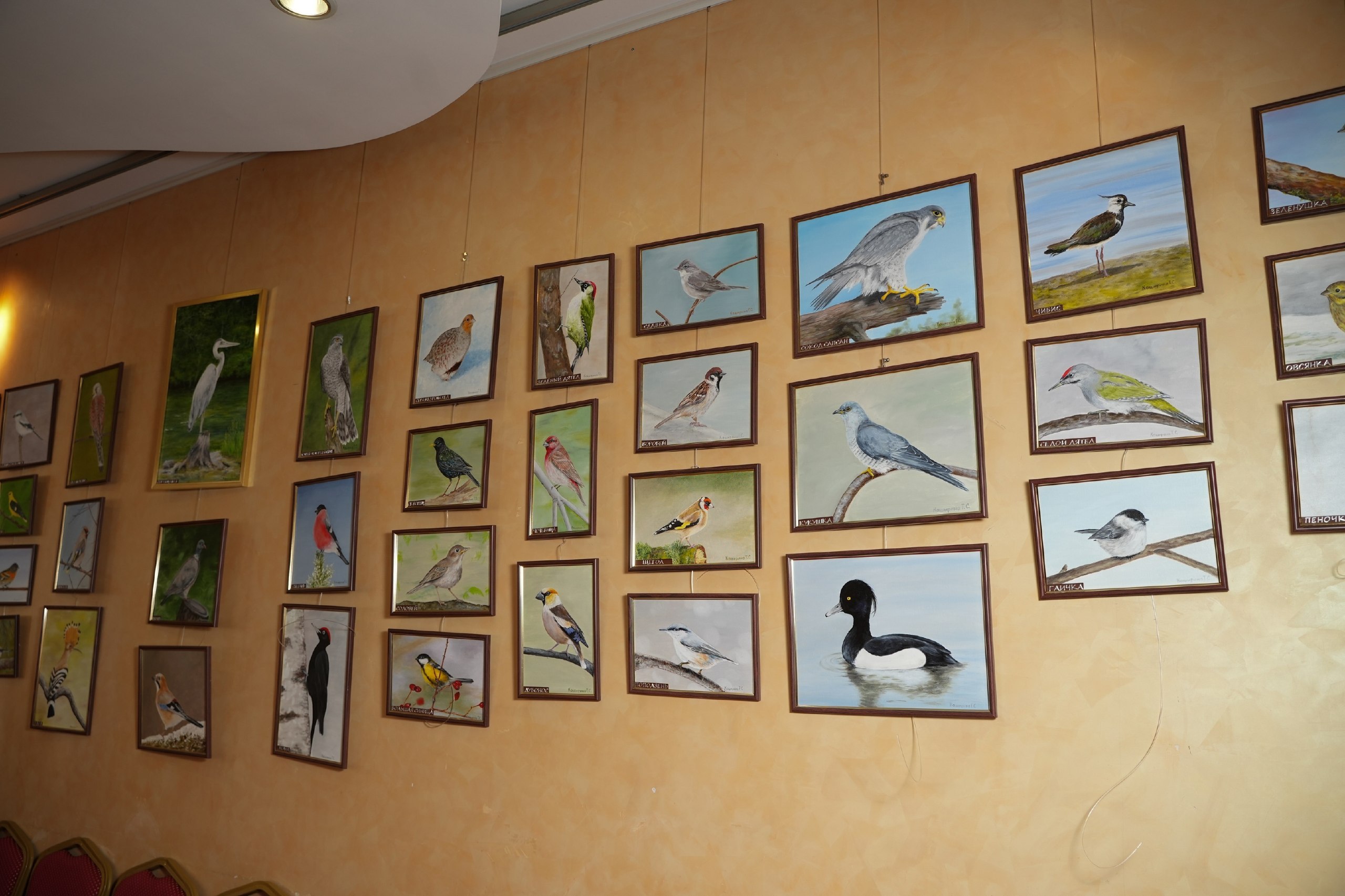 Поэтому на выставке так много маленьких и больших представителей животного мира. В начале выставки вы попадаете в мир птиц. С картин нам щебечут синица, зяблик, щегол, самый обычный воробей и еще много других представителей пернатых. Отдельным блоком представлены несколько картин с пейзажами и животными. С картин на нас хищно смотрит тигр или распушил свои перья, красуясь, белый павлин. Представленные работы отличаются высочайшим уровнем реализма и мастерства исполнения.