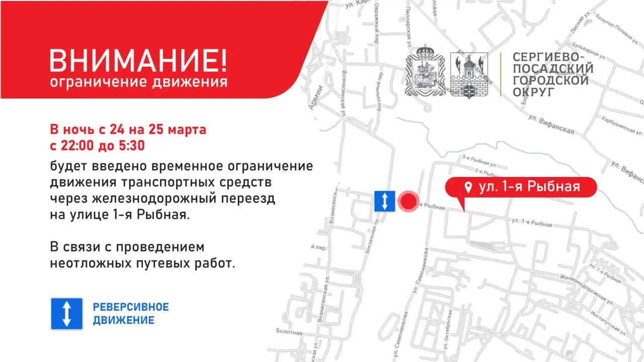В ночь с 24 на 25 марта с 22:00 до 5:30 будет введено временное ограничение движения транспортных средств через железнодорожный переезд на улице 1-я Рыбная в связи с проведением неотложных путевых работ.