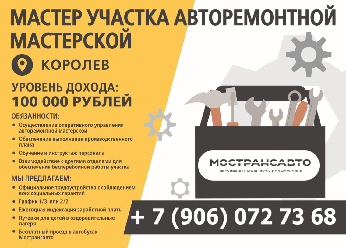 Компания «Мострансавто» ищет квалифицированного мастера участка авторемонтной мастерской в городе Королёве.