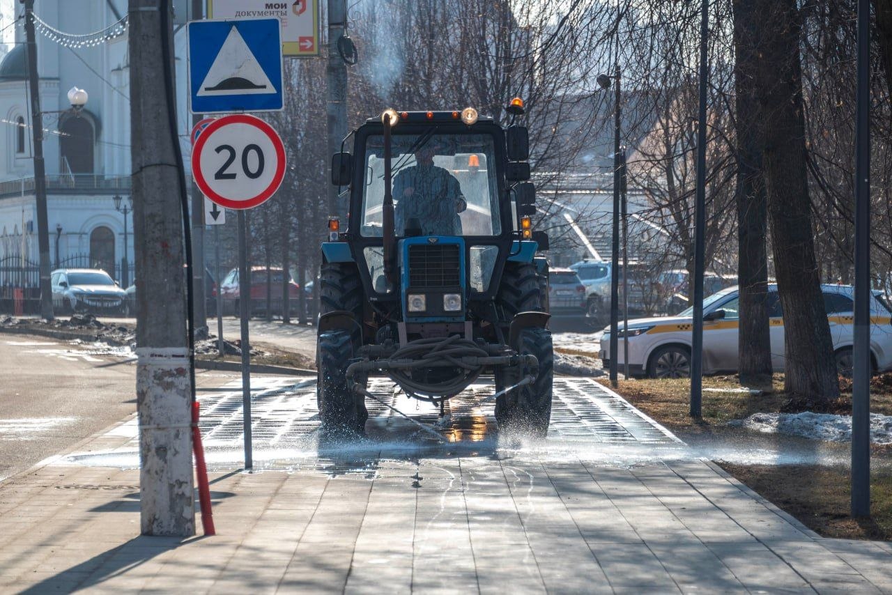 Проводится комплексная работа: очищают и моют автобусные остановки, убирают остатки снега, скалывают наледь, подметают пешеходные дорожки. Особое внимание уделяется проезжей части - дороги промывают от зимних загрязнений.