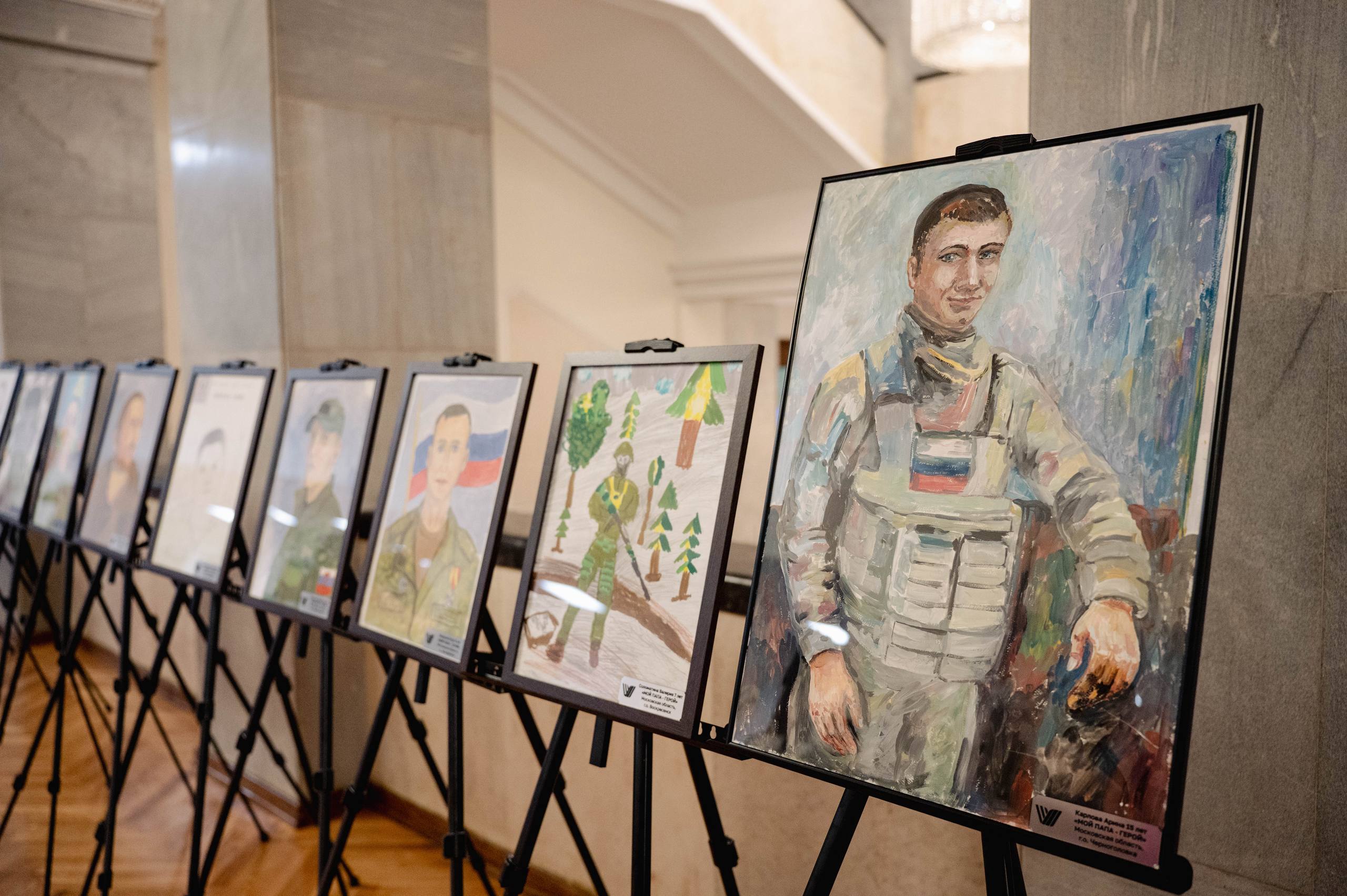 Напомню, с мая по октябрь 2025 года в рамках художественного фестиваля «Мой папа – Герой!» мы, Ассоциация ветеранов СВО Московской области при поддержке Губернатора Андрея Юрьевича Воробьёва, провели 115 мастер-классов в 35 округах и объединили более тысячи мальчишек и девчонок из семей подмосковных Героев-участников спецоперации.Под чутким руководством наставников – опытных художников и волонтёров – ребятишки познакомились с основами портретной живописи, написали портреты своих отцов. Из работ мы сформировали полноценную экспозицию, которая уже была показана в Доме Правительства Московской области и Музее Победы, а сегодня открылась в Государственной Думе.