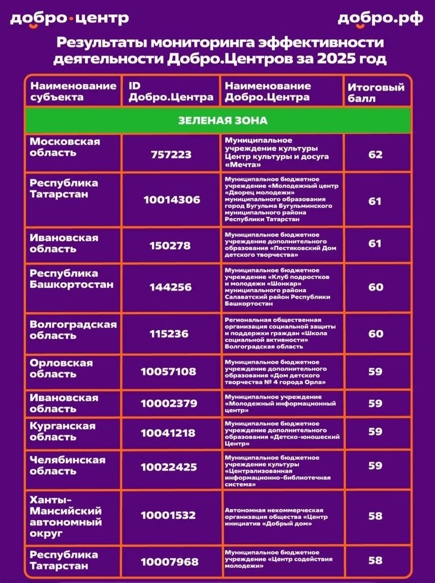 По итогам мониторинга за 2025 год Добро.центр ЦКД «Мечта» г. Орехово-Зуево занял первое место среди более тысячи волонтёрских организаций страны.
