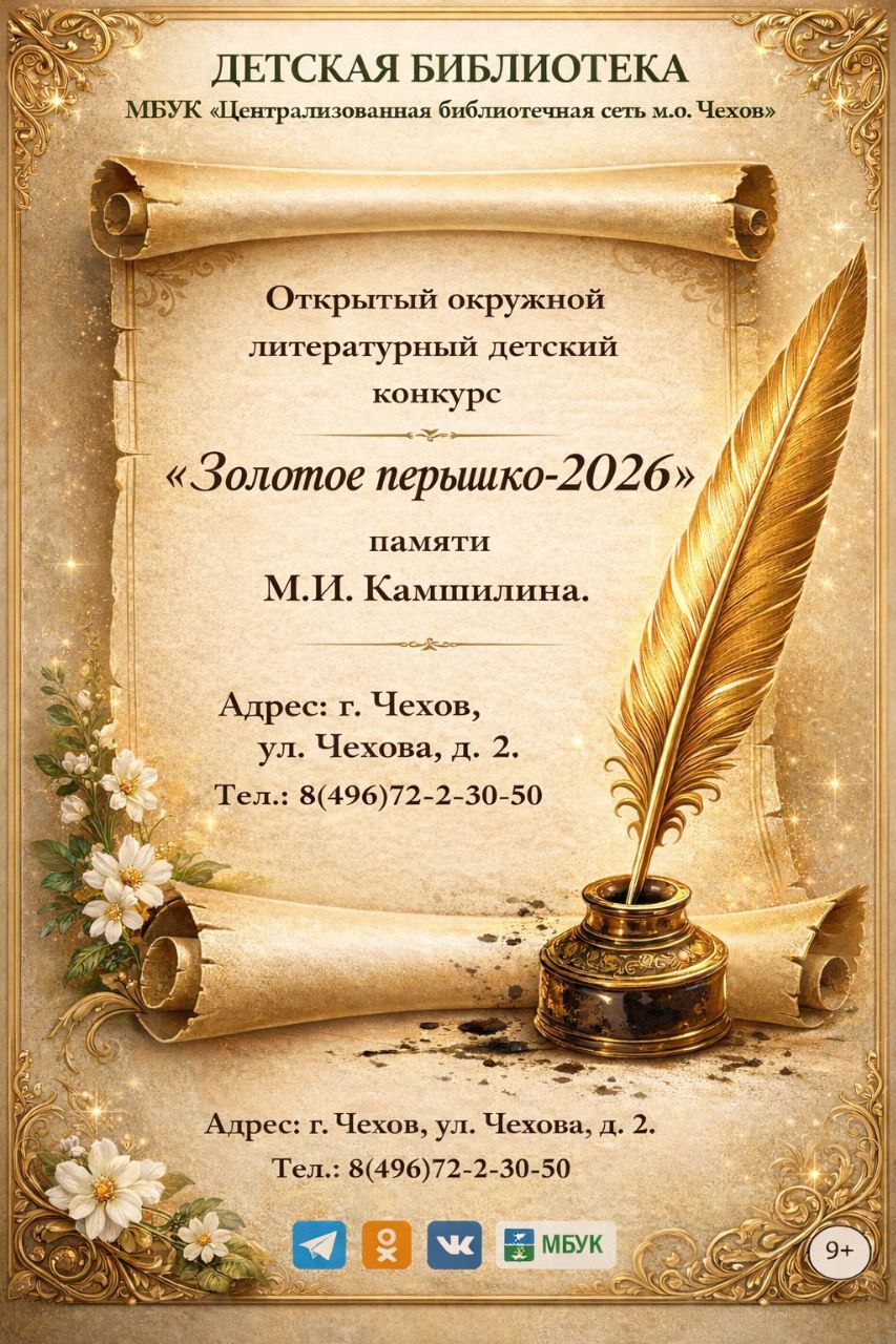 Детская библиотека приглашает принять участие в традиционном литературном детском конкурсе «Золотое пёрышко-2026» памяти Михаила Ивановича Камшилина – фронтовика, члена Союза писателей, почётного гражданина Чехова.