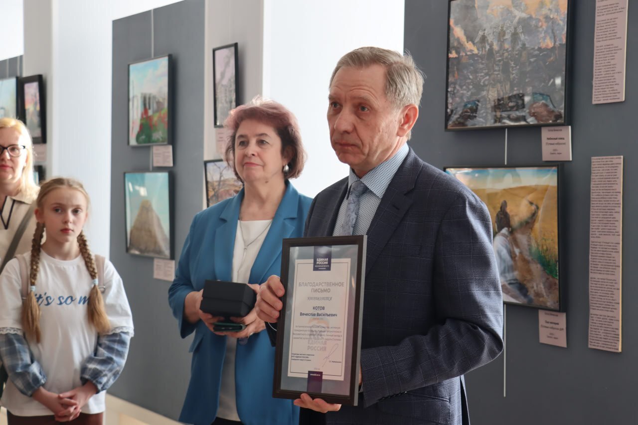 «Сегодня мы собрались в рамках партийного проекта «Культура малой родины», чтобы увидеть работы нашего земляка-художника. Рядом — участники СВО, жители. Эти работы важны. Война закончится, но в памяти останется то, что запечатлено художником. Подрастающее поколение должно знать правду. Мы не могли бросить наших людей в Донбассе, Запорожье, Херсоне. Минские соглашения 8 лет не исполнялись. Картины передают эмоции, взгляд очевидца. Подсолнухи живые и погибшие после обстрелов — это видит только тот, кто там был. Такие события помогают ценить жизнь и строить будущее».
