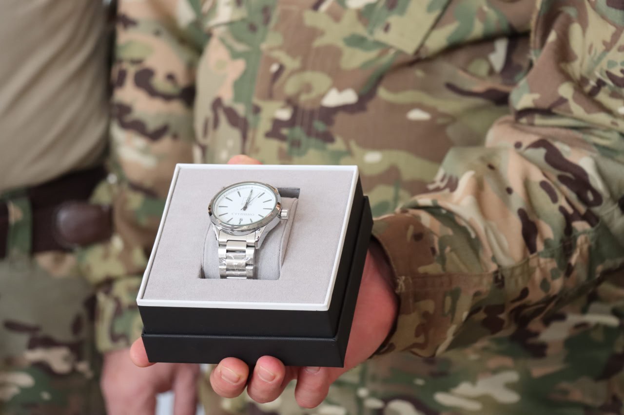 Александр Сухачев передал председателю местного отделения Ассоциации Ветеранов СВО Дмитрию Путренко благодарственное письмо Вячеславу Котову за проявленное мужество и активную гражданскую позицию, пример патриотизма и беззаветного служения Родине и развитие культуры городского округа Ступино, а также часы с символикой муниципалитета.