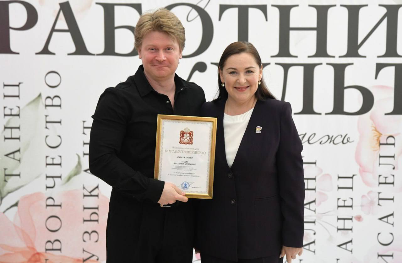 Марина Шевченко, депутат Мособлдумы, также поздравила коллег и вручила благодарственное письмо Мособлдумы Владимиру Котику, ведущему мастеру сцены Дмитровского драмтеатра.
