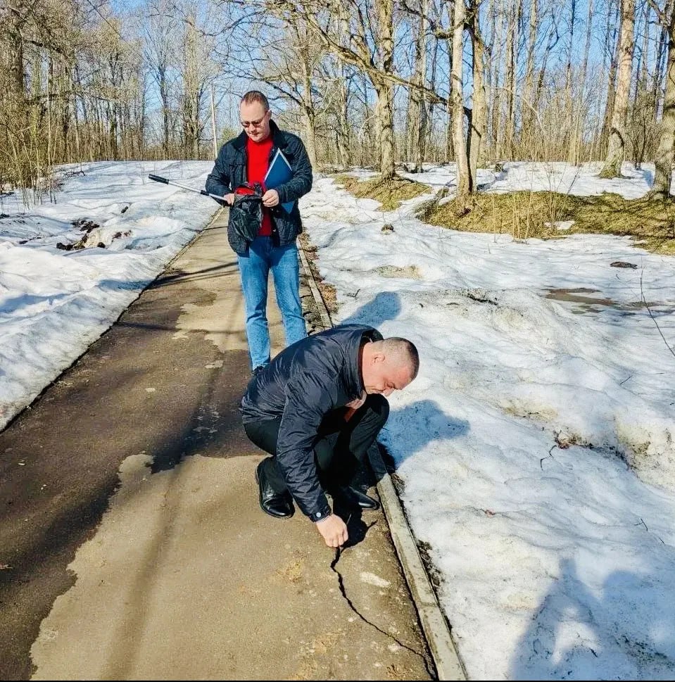 В ходе осмотра зафиксированы недостатки: трещины асфальтобетонного покрытия и отслоения бортового камня.
