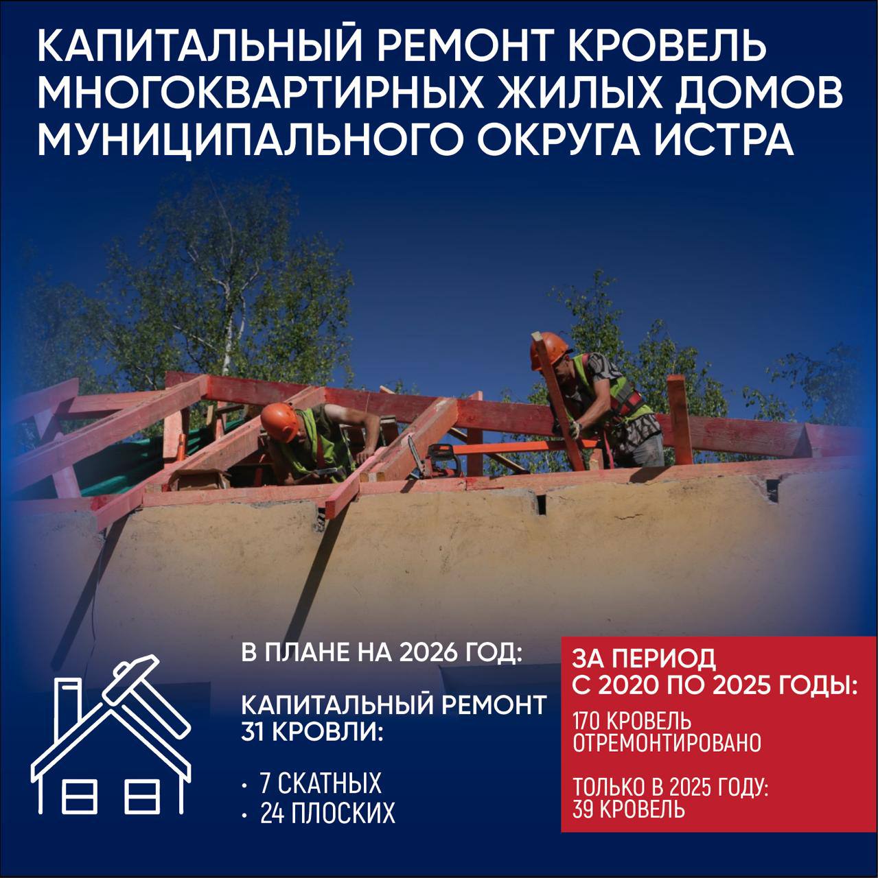 Только в прошлом 2025 году капитальный ремонт был выполнен на 39 многоквартирных домах в Истре, Дедовске, Рождествено, Агрогородке и Чеховском. В планах же на 2026 год капитально отремонтировать ещё 31 кровлю.