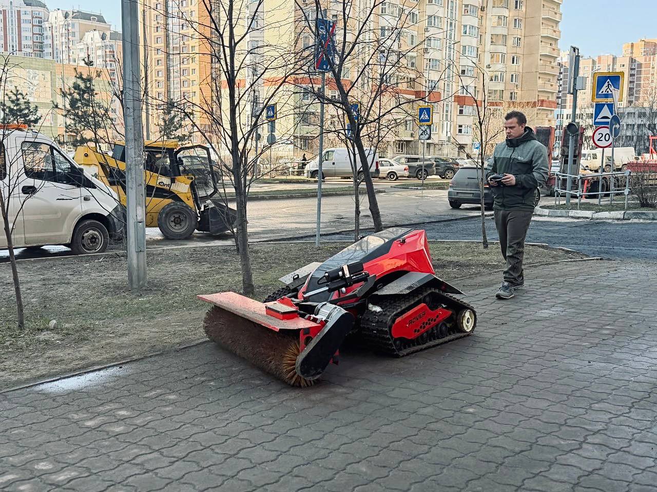 Компактная машина управляется с пульта предназначена для уборки территорий, куда не может пройти крупная коммунальная техника. Сегодня робот задействован на улице Победы — он очищает тротуары. Такая техника особенно эффективна на велодорожках, узких тротуарах и участках с ограниченным пространством, где использование тракторов затруднено. При этом робот способен выполнять и задачи по уборке дорожного покрытия.