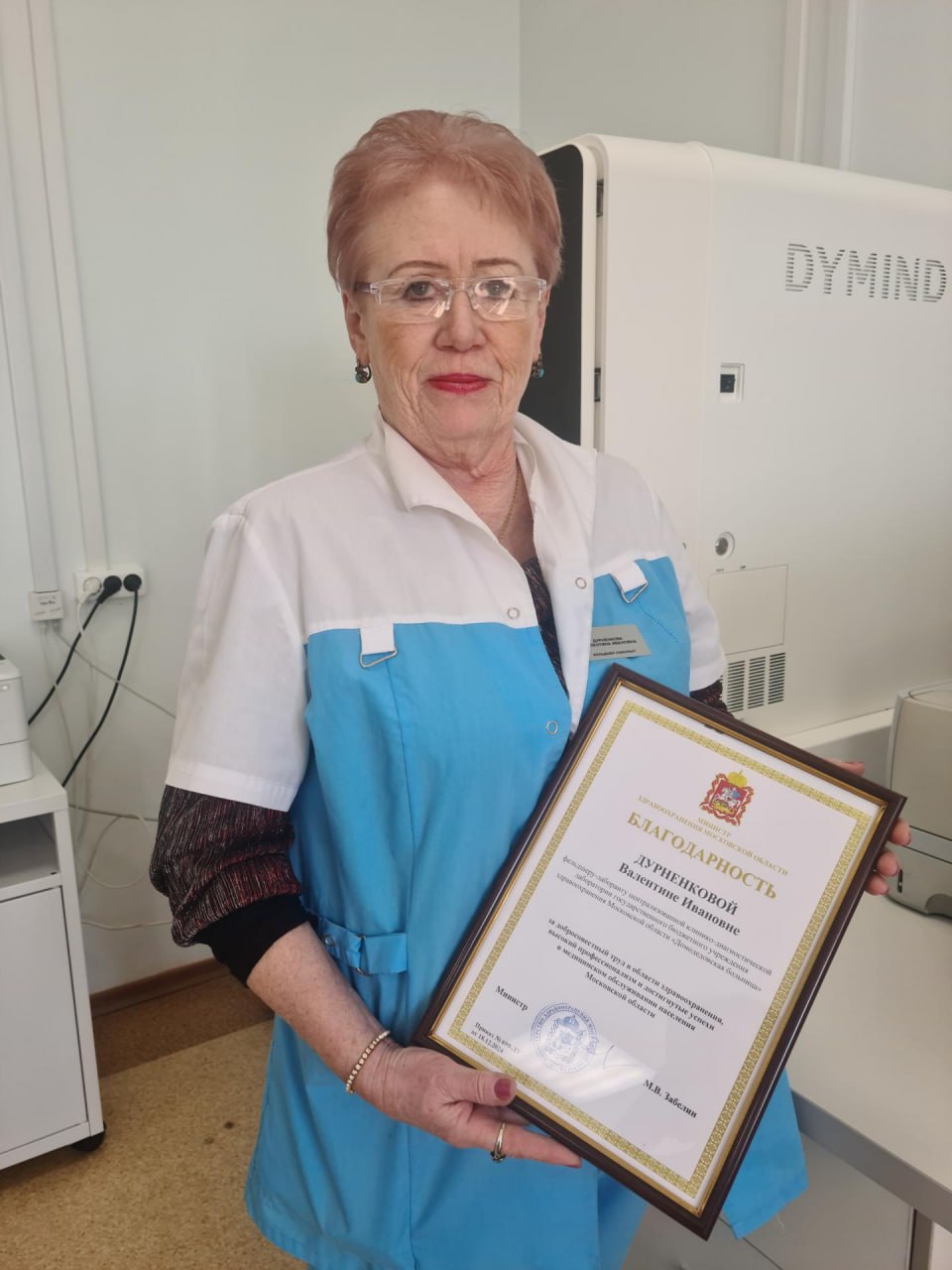 Фельдшер-лаборант клинико-диагностической лаборатории Домодедовской больницы Валентина Дурненкова получила Благодарность Министерства здравоохранения Московской области за многолетний труд, высокий профессионализм и преданность делу.