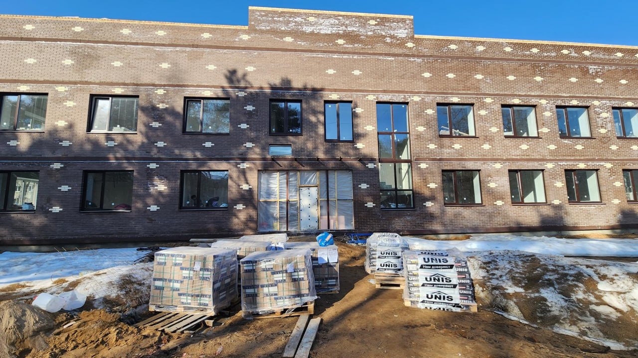 На объекте завершены основные строительно-монтажные работы: возведено здание пристройки, готова кровля.