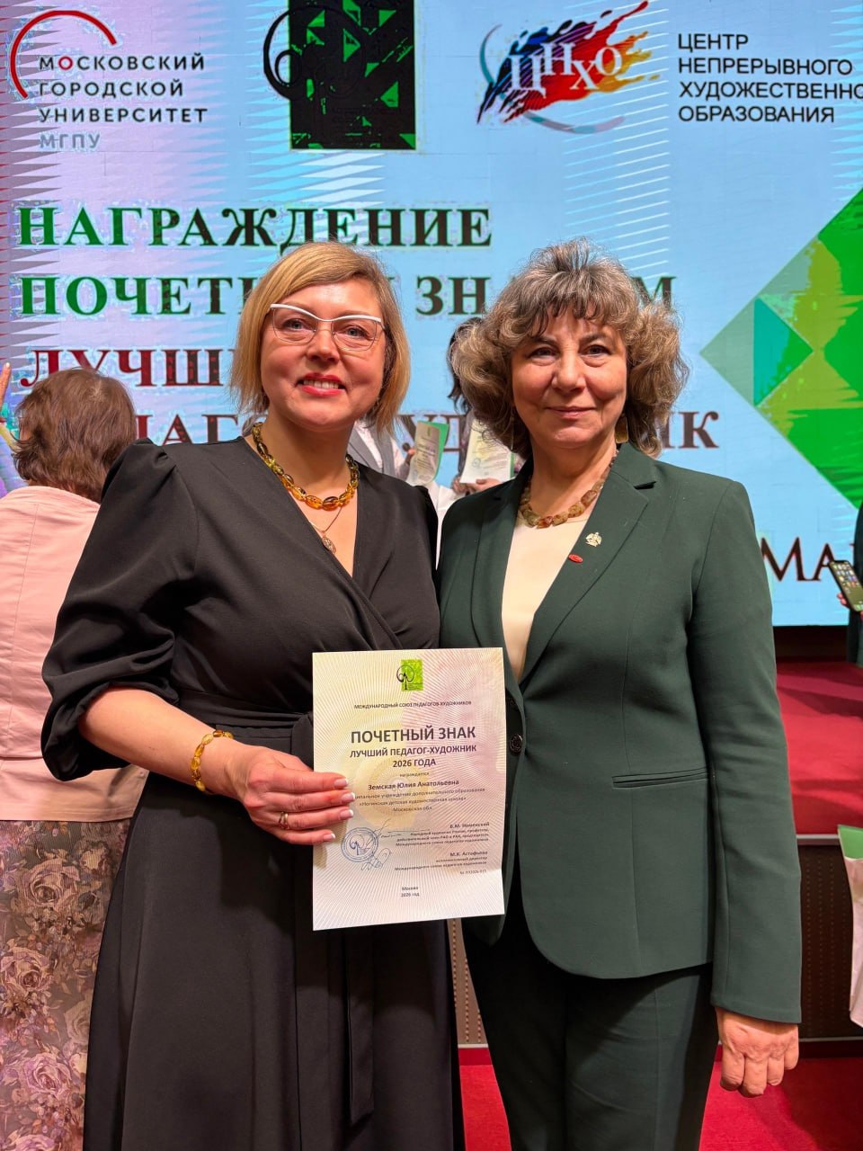 Почётный знак «Лучший педагог-художник» из рук академика Российской академии художеств Ларисы Неменской получила директор Ногинской детской художественной школы Юлия Земская. Для неё это уже вторая награда от Центра непрерывного художественного образования МГПУ.