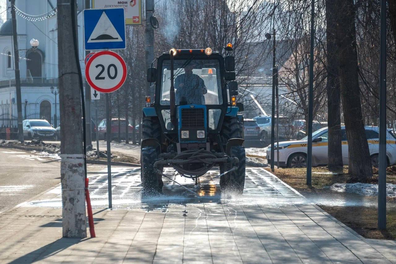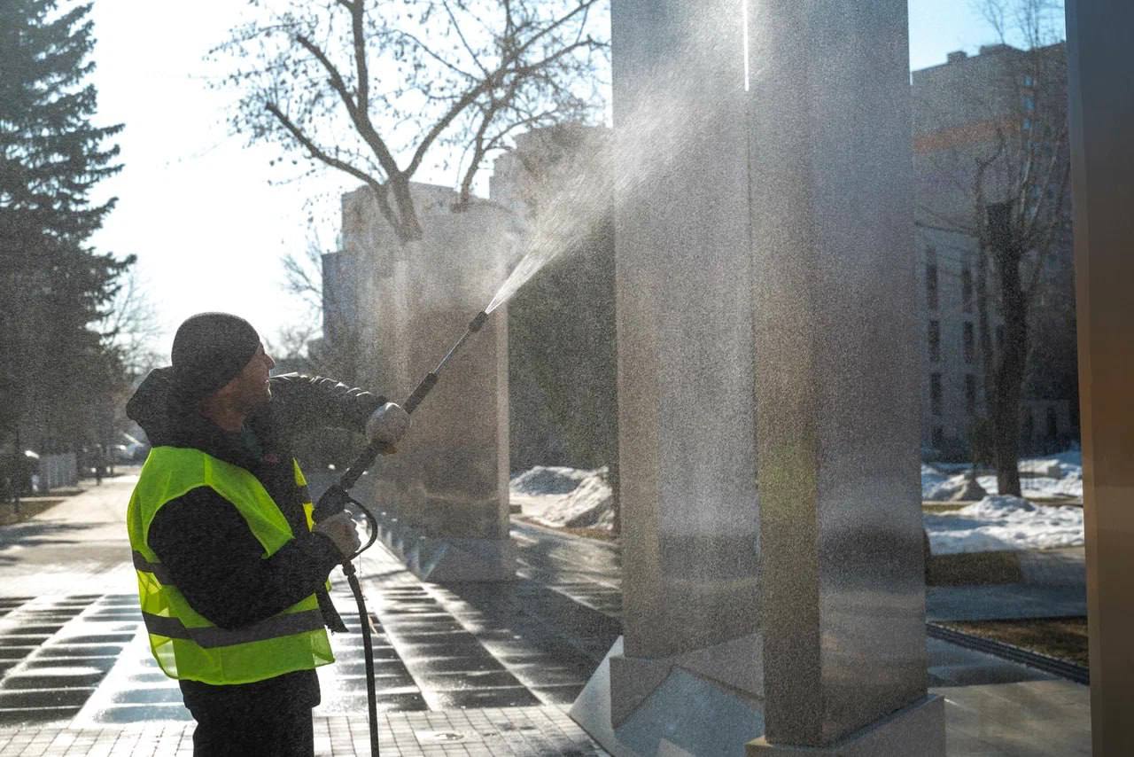 в парках и на общественных территориях завершены мойка пешеходных дорожек и ручной сбор мелкого мусора с газонов.