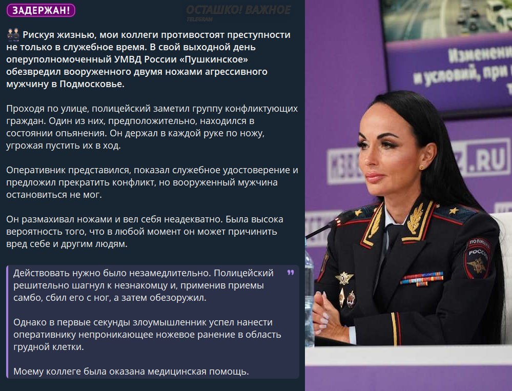 Правоохранитель применил приём самбо, сбил нападавшего с ног и выбил ножи. В ходе задержания злоумышленник успел нанести ему ножевое ранение в область груди, — сообщила официальный представитель МВД Ирина Волк.