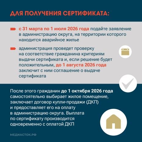«Президент поручил внимательно решать задачу расселения аварийного жилья. В Подмосковье, чтобы держать хороший темп, мы не только строим новые дома, но также используем такой инструмент, как жилищный сертификат. Многие жители выбирают именно его — потому что не нужно ждать, когда введут новый дом, не нужно привязываться к одной локации, — отметил губернатор Московской области Андрей ВОРОБЬЕВ.— Сегодня мы запускаем новую программу выдачи сертификатов на переселение из аварийного жилья. Собственники такого фонда и наниматели по соцнайму до 1 июля могут обратиться в администрацию округа. И, если все условия соблюдены, до 1 августа заключают соглашение, а до 1 октября должны будут выбрать подходящий вариант в любом муниципалитете Подмосковья. Это может быть готовая квартира в новостройке, строящемся МКД или первоначальный взнос по ипотеке».
