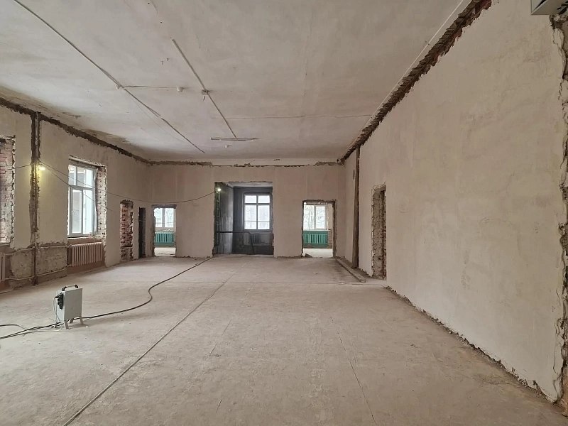 На данный момент продолжаются демонтажные работы, параллельно ведётся оштукатуривание стен. В ближайшее время подрядчик приступит к усилению оконных и дверных проёмов металлическими конструкциями.