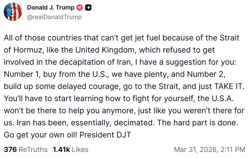 Все те страны, которые не могут получать авиационное топливо из-за Ормузского пролива, такие как Соединённое Королевство, которое отказалось участвовать в обезглавливании Ирана, у меня есть для вас предложение: во-первых, покупайте у США, у нас его предостаточно, и, во-вторых, наберитесь запоздалой смелости, отправляйтесь к проливу и просто ЗАБЕРИТЕ ЕГО. Вам придётся начать учиться сражаться за себя, США больше не будут рядом, чтобы помогать вам, так же как вы не были там для нас. Иран, по сути, практически разгромлен. Самое сложное уже сделано. Идите и добудьте свою нефть сами!
