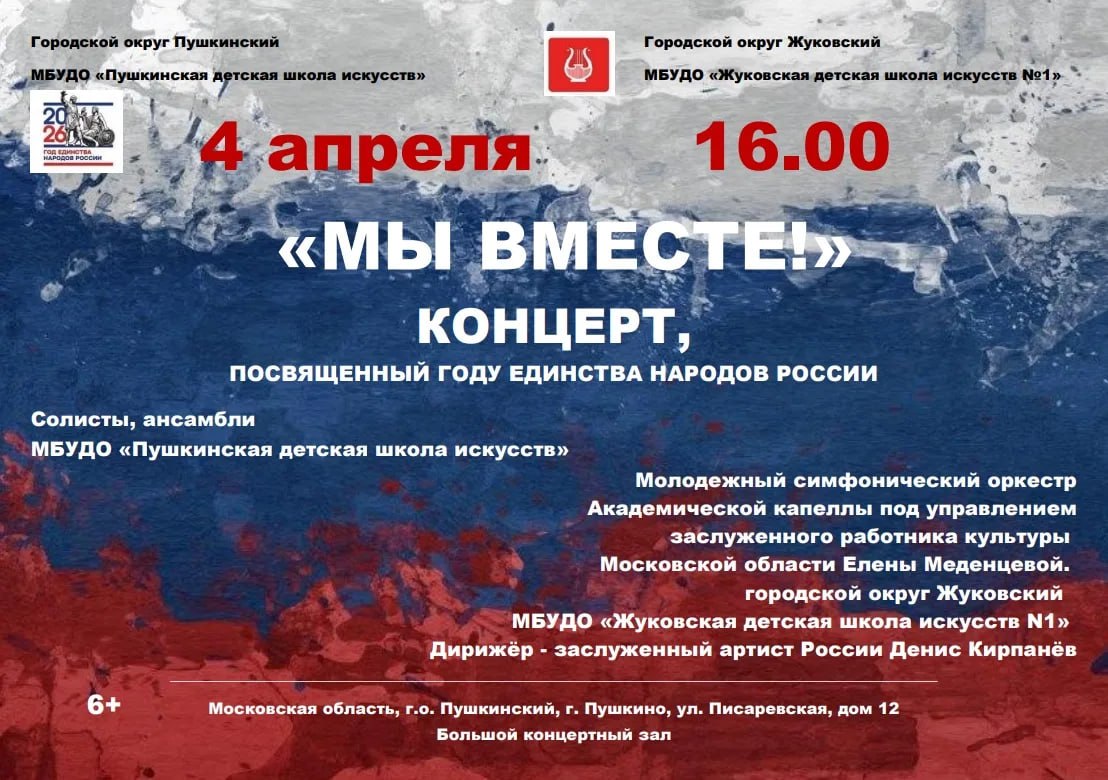 Приглашаем вас на концерт под названием «Мы вместе!», призванный отметить Год единства народов России. На сцене выступят талантливые коллективы, солисты и ансамбли из двух учреждений: Жуковской детской школы искусств №1 и Пушкинской детской школы искусств.