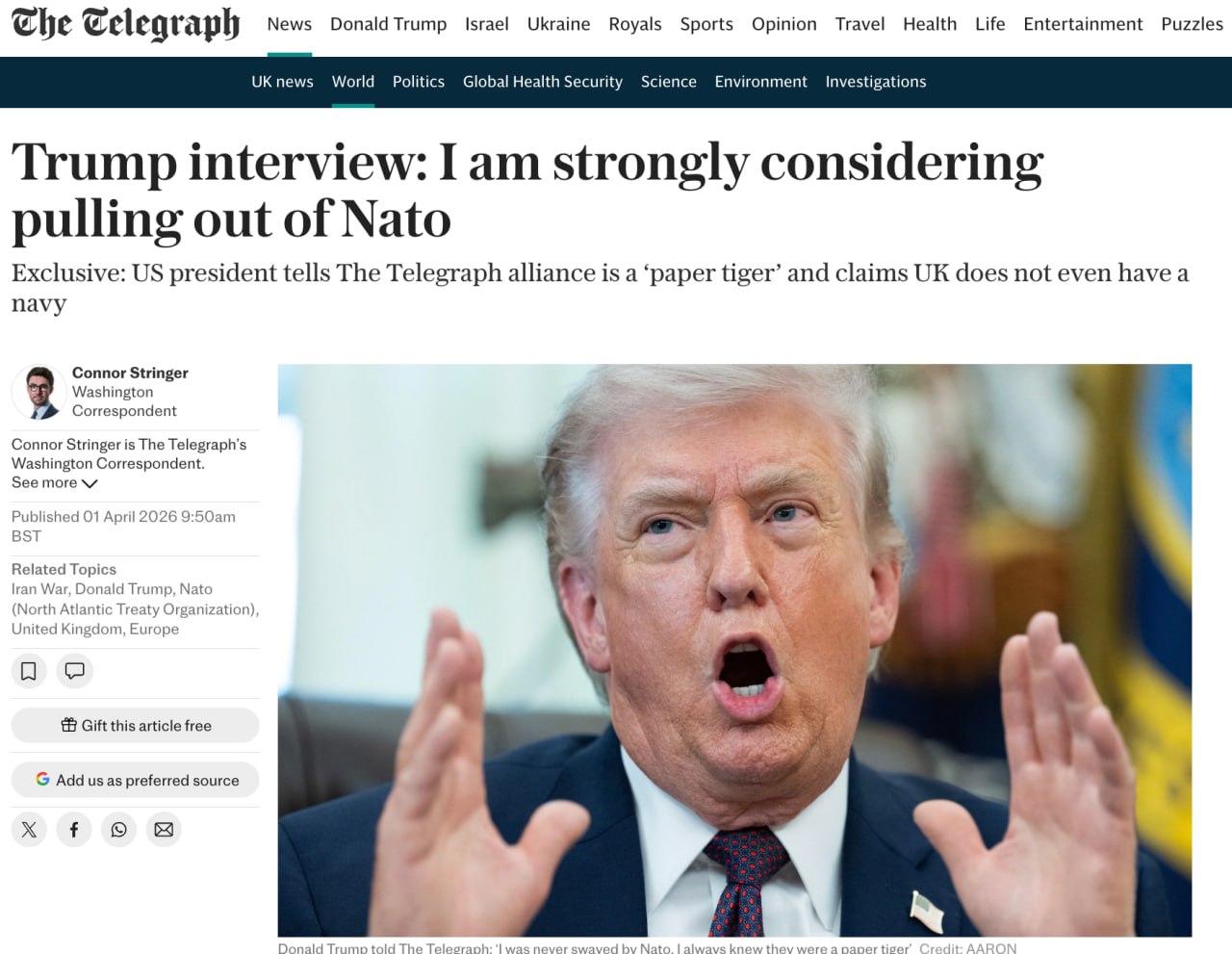 Трамп серьёзно рассматривает выход США из НАТО. Об этом президент заявил в интервью The Telegraph.