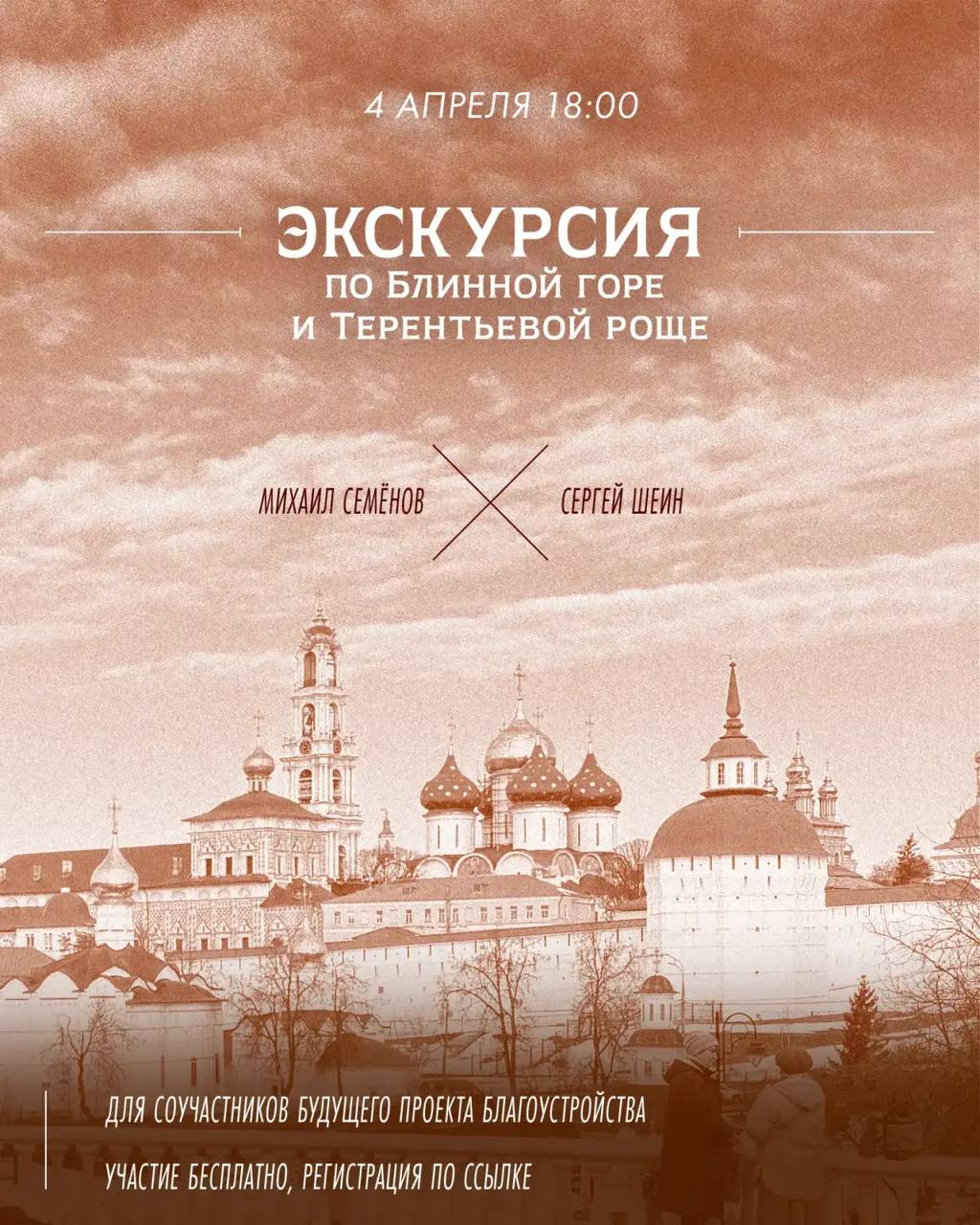 4 апреля урбанист, дизайнер и художник Михаил Семёнов совместно с филологом и экскурсоводом Сергеем Шеиным проведет экскурсию по Блинной горе и Терентьевой роще в рамках подготовки проекта благоустройства территории от Блинной горы до горы Волкуша со стороны 1-й Рыбной улицы.
