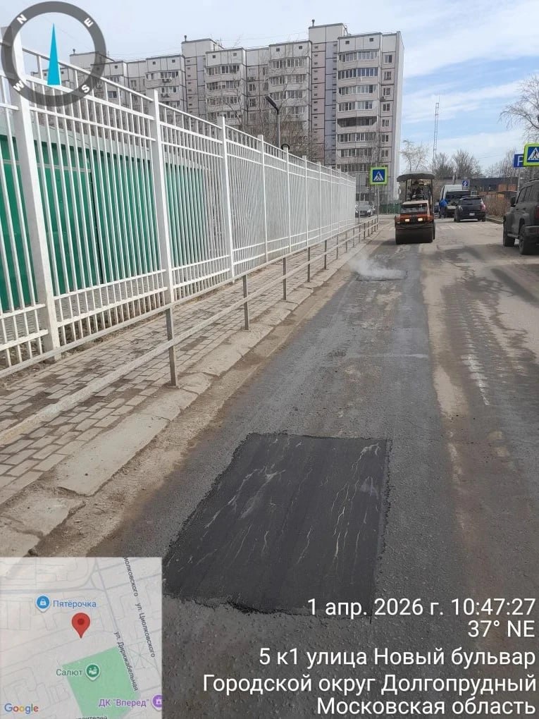 1-2 апреля работы будут проводиться по следующим адресам: Ракетостроителей, 7а, Новый бульвар, 5к1, Новый бульвар, 9к1, Новый бульвар, 7к1, Лихчёвское ш., 11а, проспект Пацаева, 18а, ул. Ак. Лаврентьева, 25-27, Институтский пер., 8, бульвар Умберто Нобиле.Задействованы 5 человек, 1 самосвал, 1 погрузчик, 1 каток+1эвакуатор, 1 «газель».