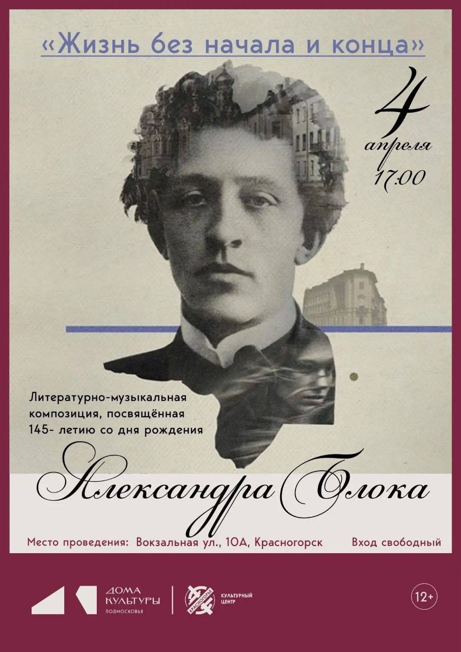4 апреля в Культурном центре «Красногорье» состоится литературномузыкальная композиция «Жизнь без начала и конца», посвященная 145летию Александра Блока.