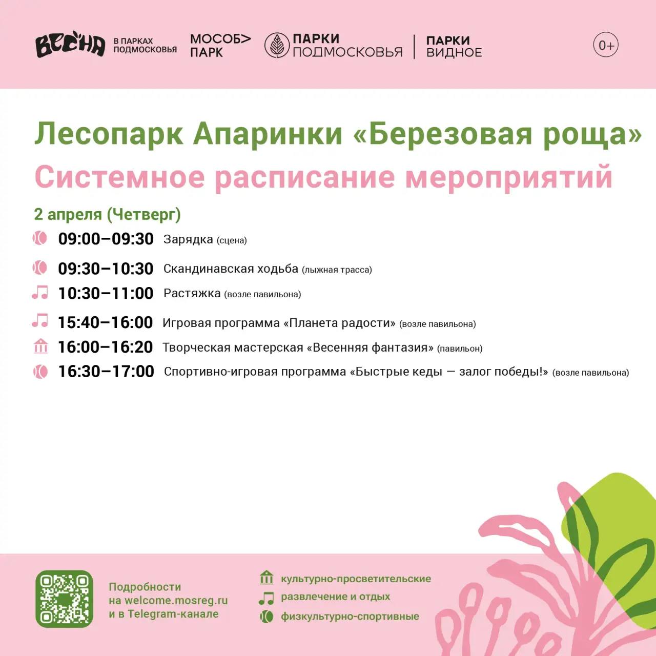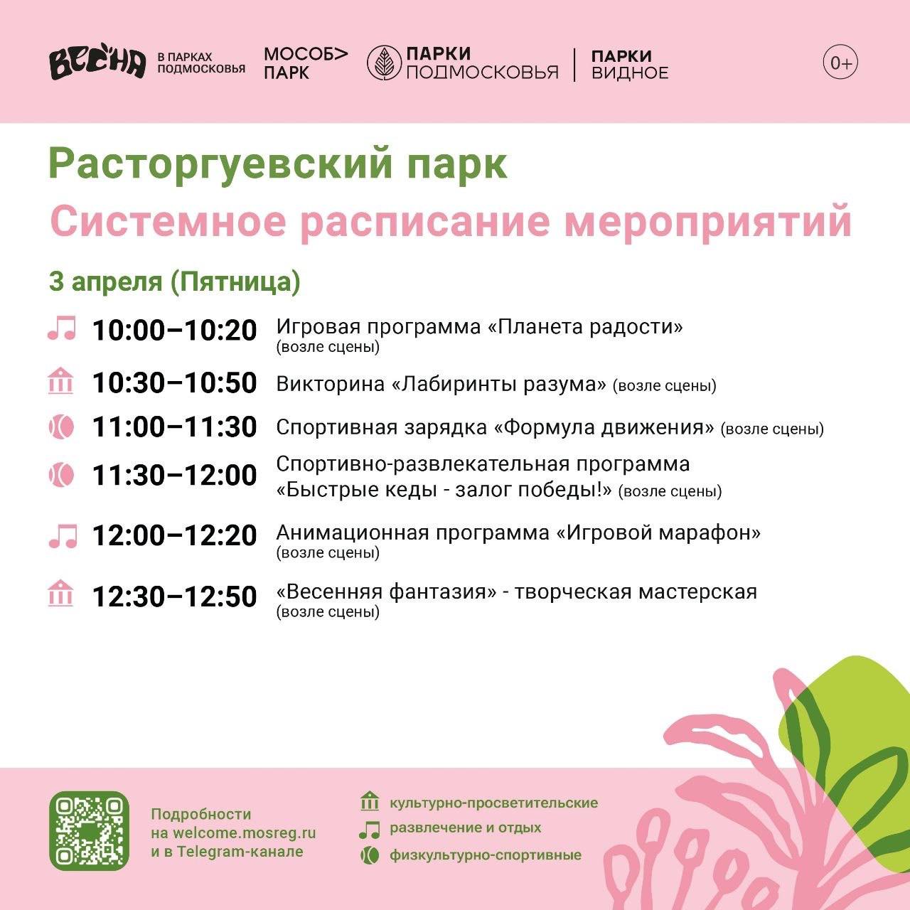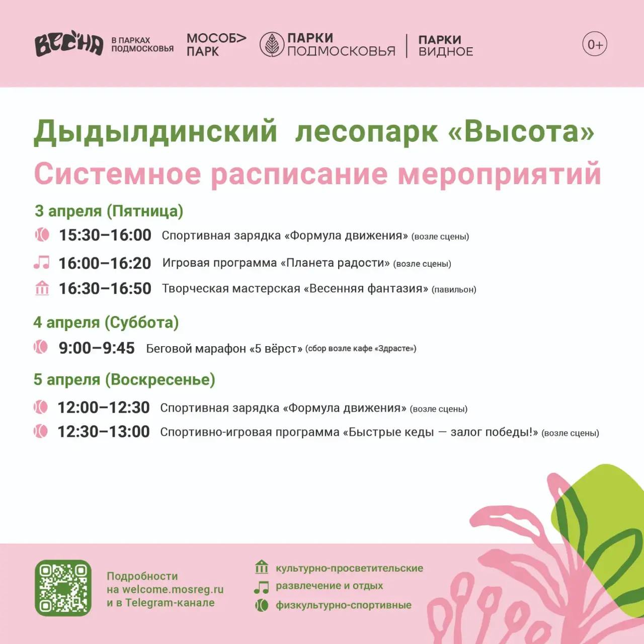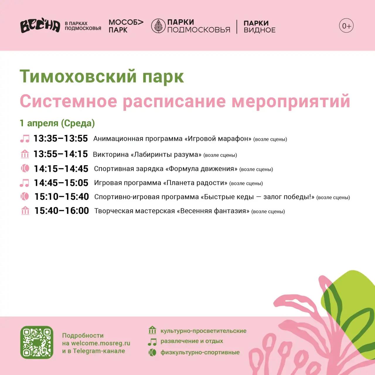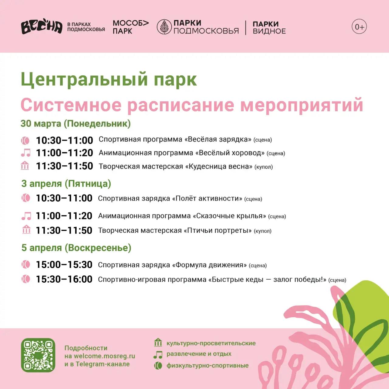 Уважаемые гости Видных парков, мы подготовили для вас афишу мероприятий на эту неделю, с 30 марта по 5 апреля.