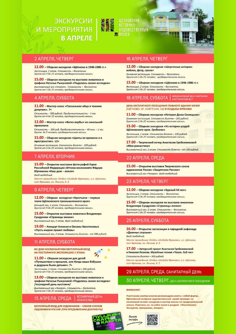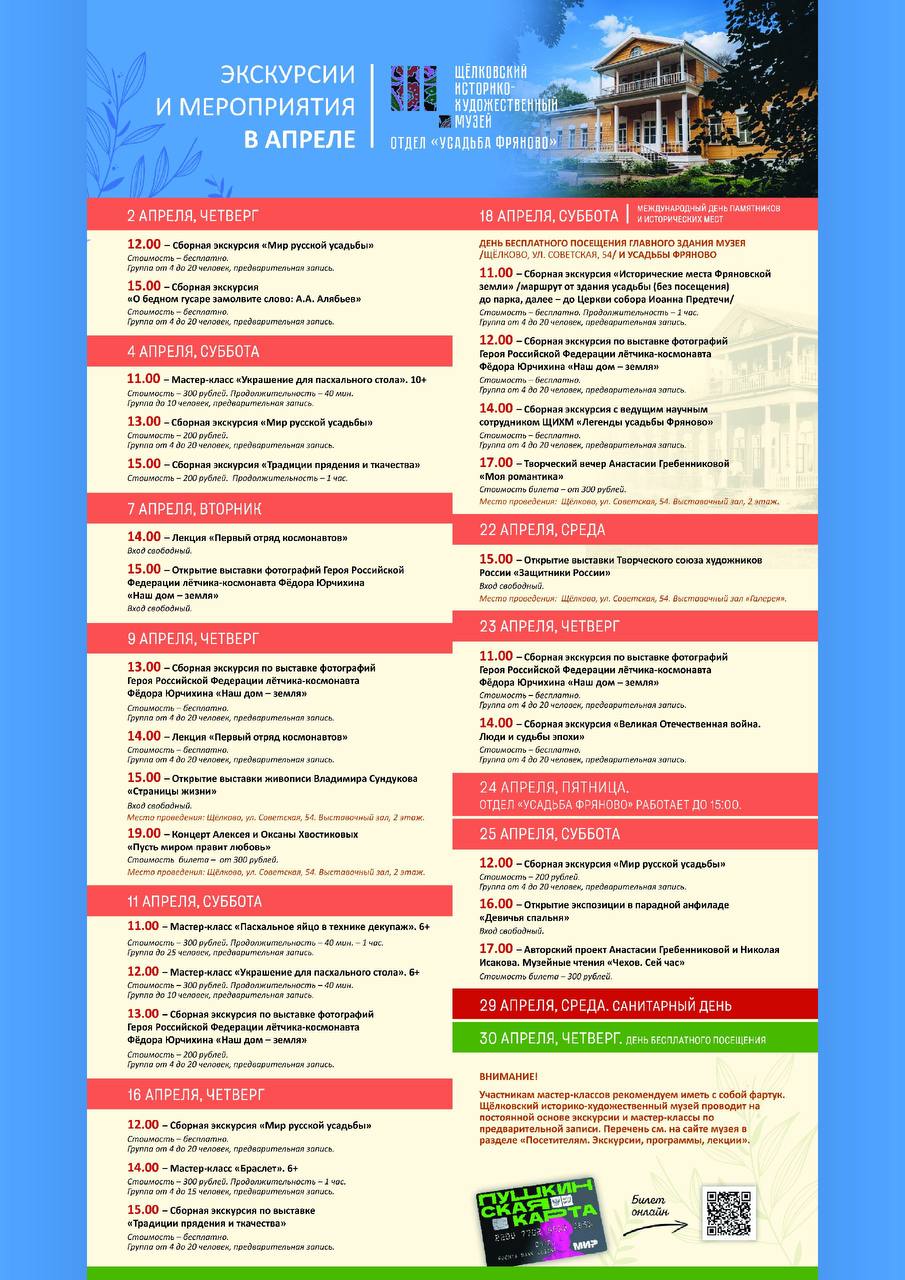 Афиша мероприятий на апрель от Усадьбы Фряново и Щёлковского музея