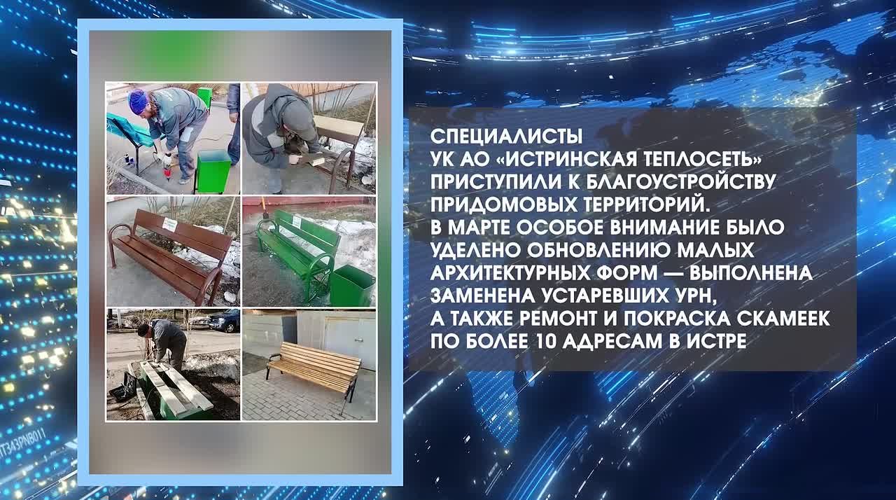 Специалисты УК АО «Истринская теплосеть» приступили к благоустройству придомовых территорий. В марте особое внимание было уделено обновлению малых архитектурных форм — выполнена заменена устаревших урн, а также ремонт и покраска скамеек по более 10 адресам в Истре.
