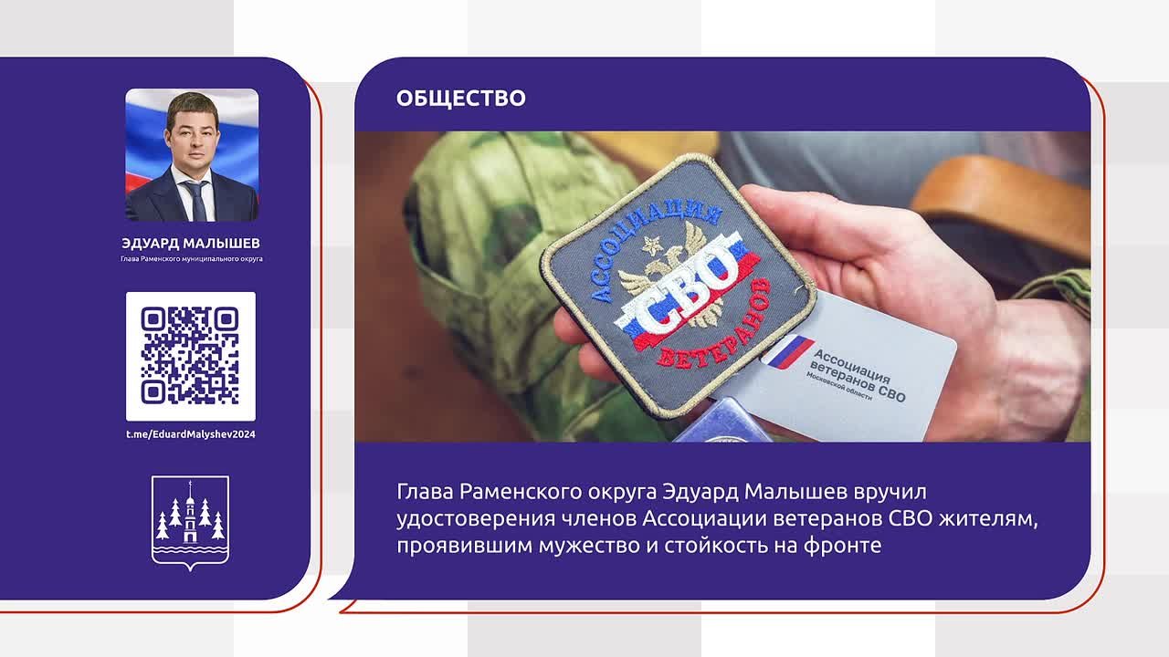 Глава Раменского округа Эдуард Малышев вручил удостоверения членов Ассоциации ветеранов СВО жителям, проявившим мужество и стойкость на фронте