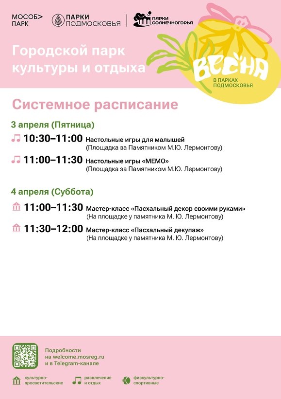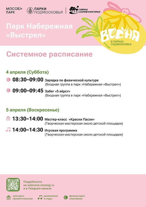 Расписание - на афишах в парке, в Telegram: https://t.me/park_soln и на сайте: https://parki.mosreg.ru
