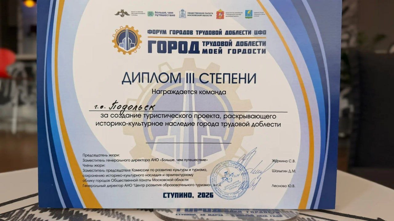 По итогам защиты конкурсных работ проект подольской команды, направленный на раскрытие историко-культурного наследия города трудовой доблести, получил высокую оценку жюри и был удостоен диплома III степени.