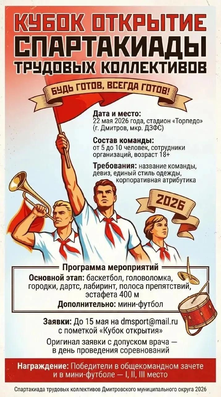 22 мая 2026 года на стадионе «Торпедо» (мкр. ДЗФС) пройдет Кубок открытия Спартакиады трудовых коллективов Дмитровского округа.