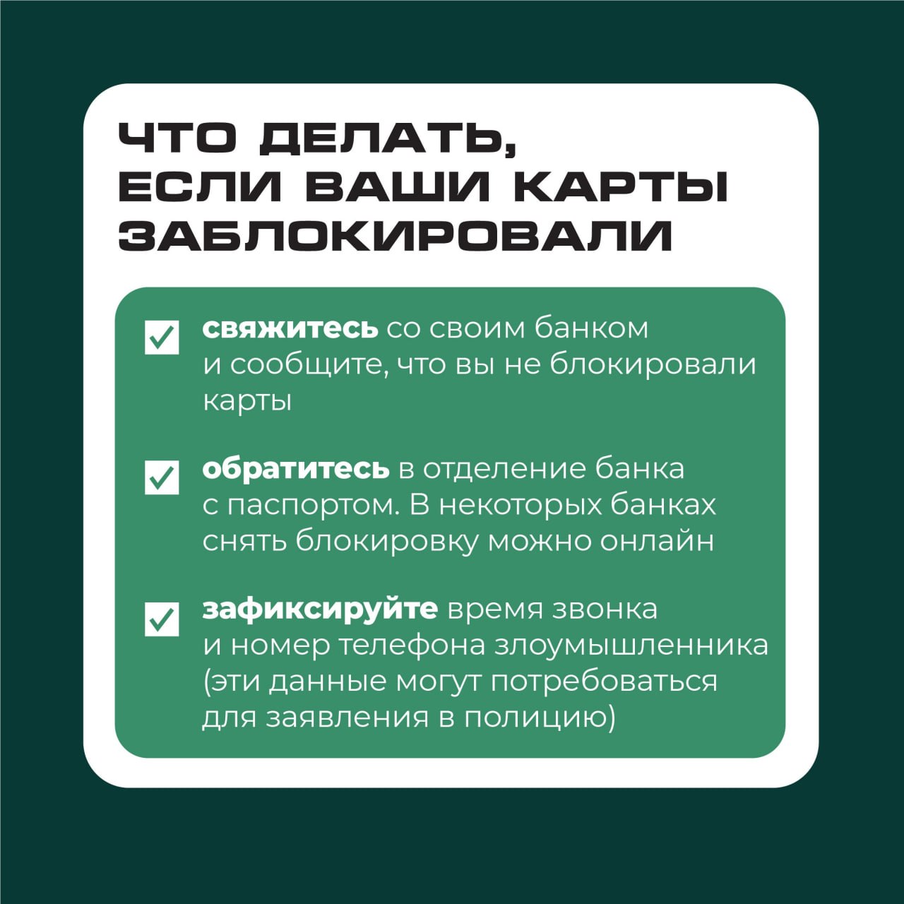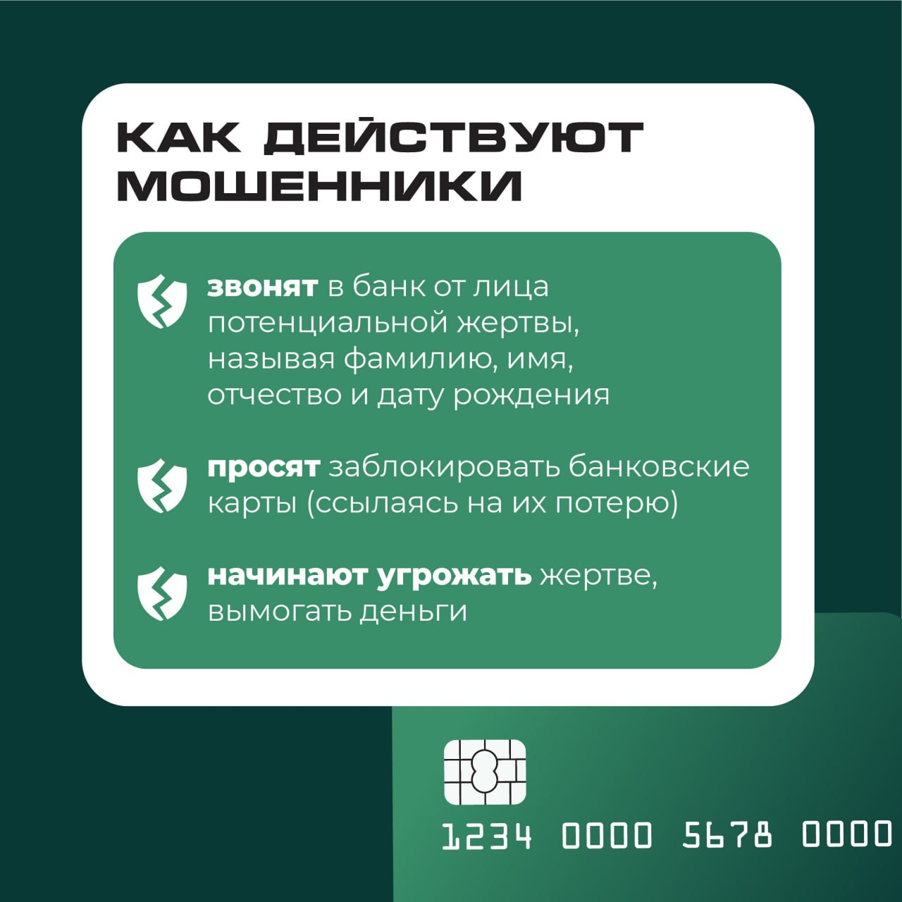 Мошенники звонят в банк от лица потенциальной жертвы и просят заблокировать карты, ссылаясь на их потерю, а затем начинают угрожать жертве и вымогать деньги.