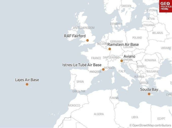 Американские бомбардировщики, беспилотники и корабли были дозаправлены, вооружены и отправлены из баз в Великобритании, Германии, Португалии, Италии, Франции и Греции: