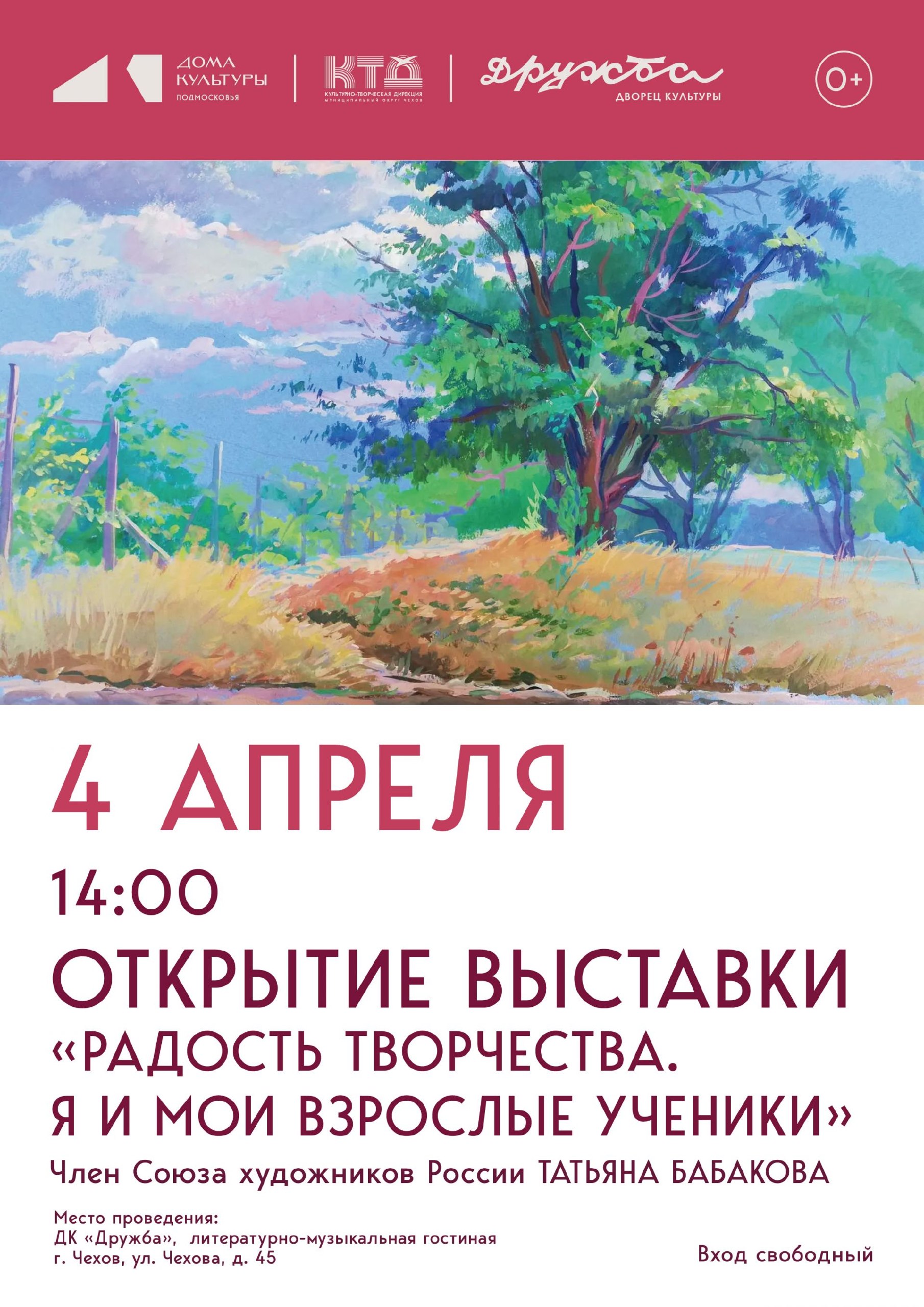 4 апреля В ДК "Дружба" г. Чехов начинает работу выставка талантливого художника, Члена Союза художников России, преподавателя высшей категории, организатора и руководителя студии рисования для взрослых – Татьяны Бабаковой