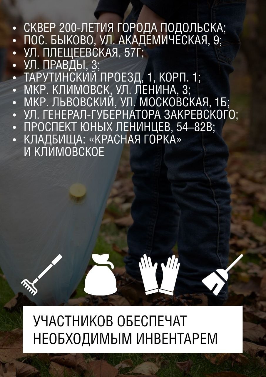 Инвентарь выдадут сотрудники Подольского комбината благоустройства на месте.