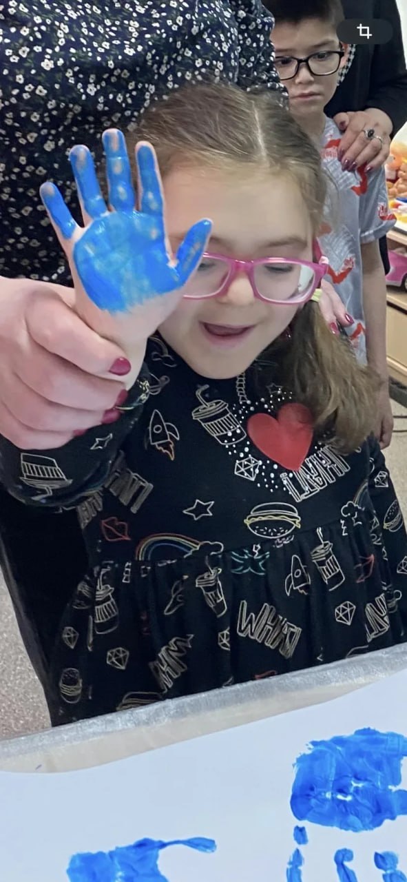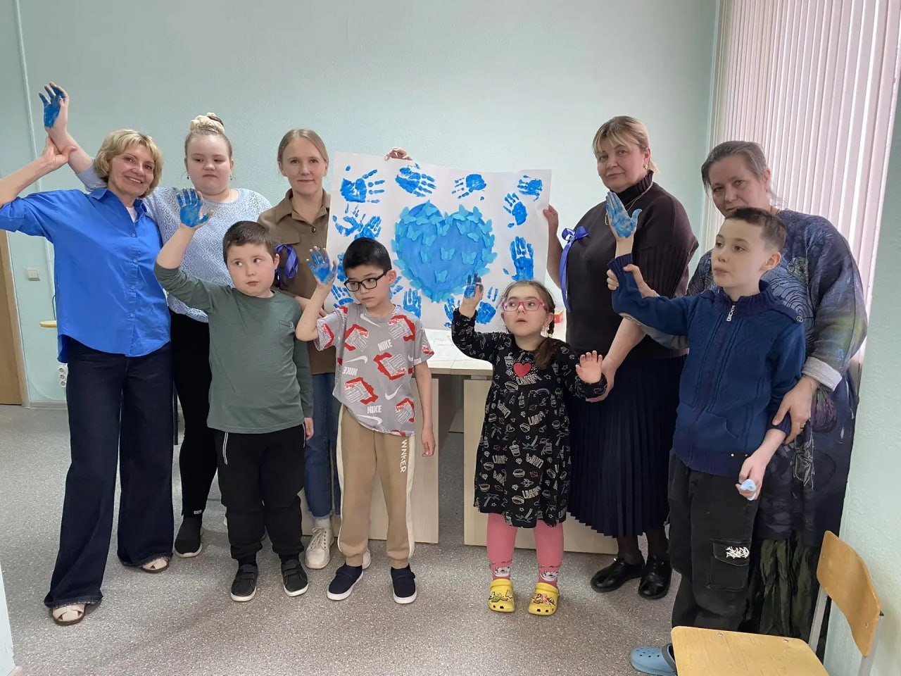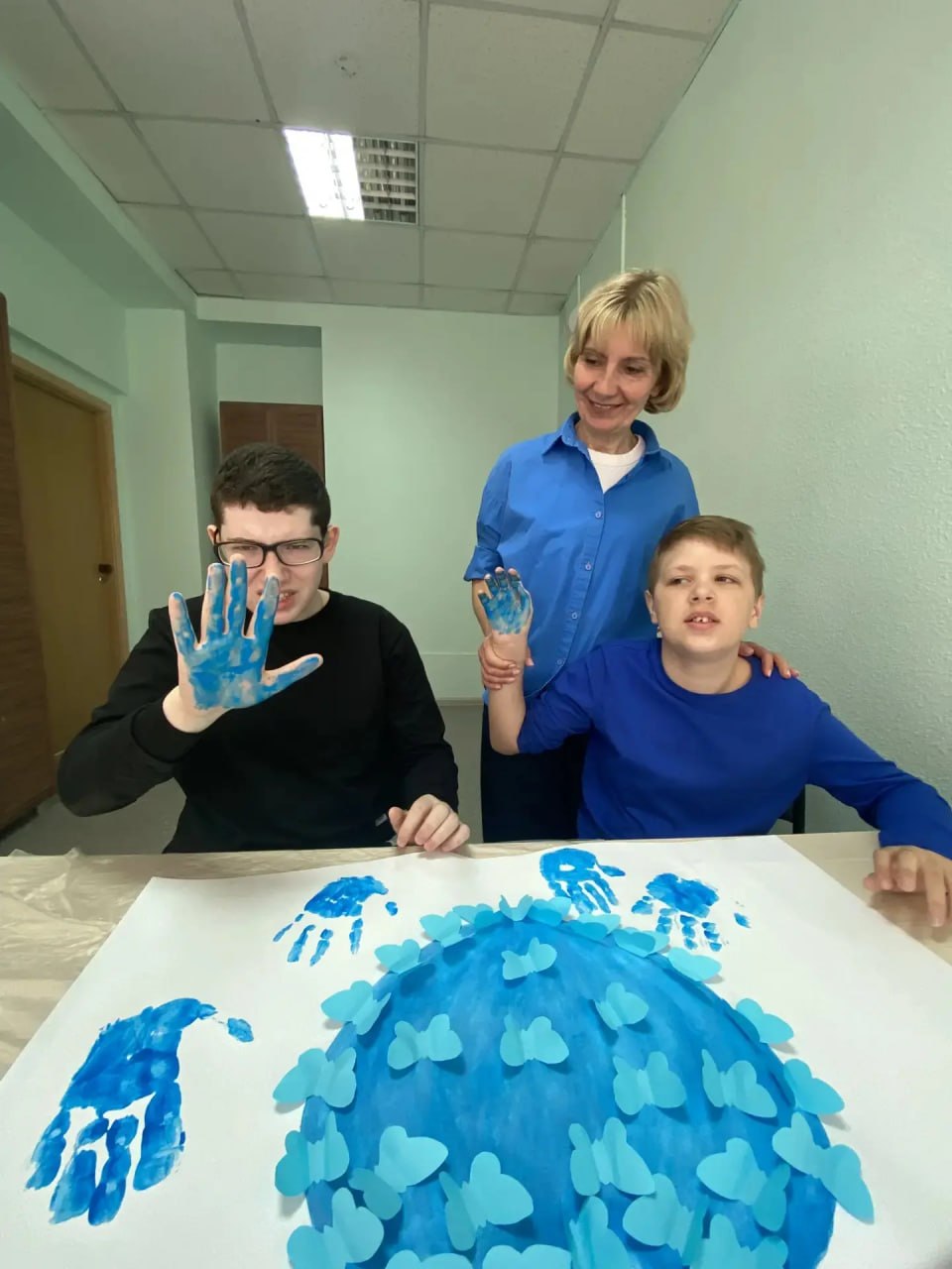 Затем состоялся трогательный мастер-класс «Ладошки доброты» — вместе с детьми и их родителями. Итогом стали творческие работы синего цвета, которые создали сами дети.