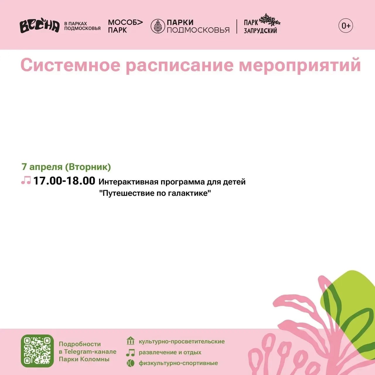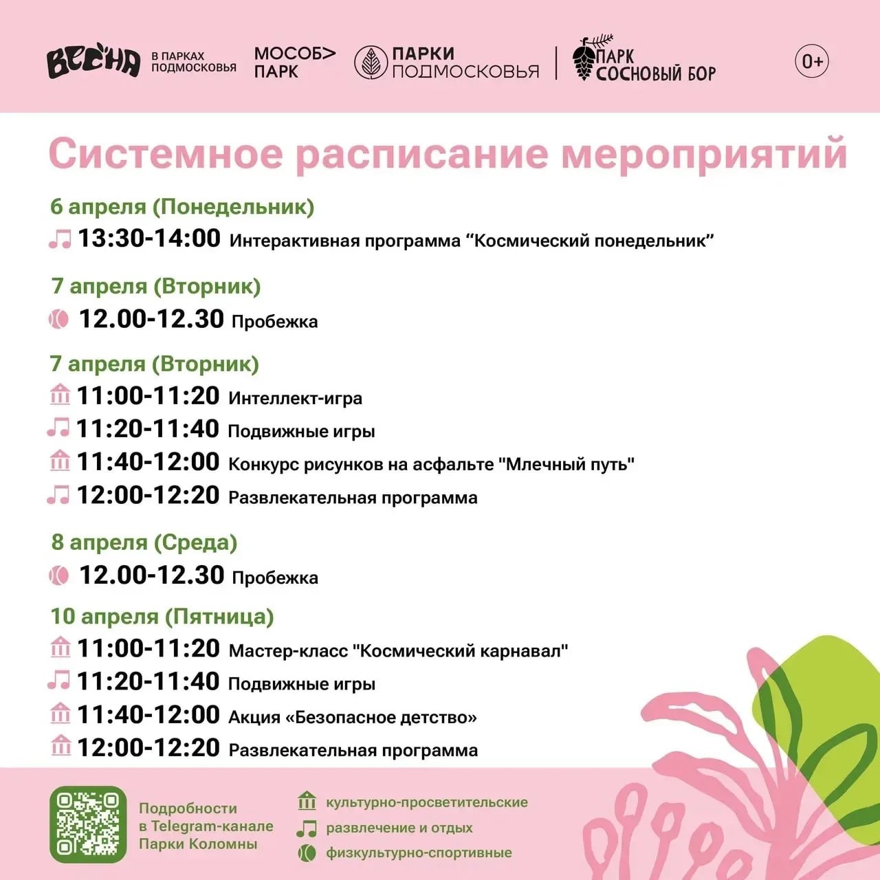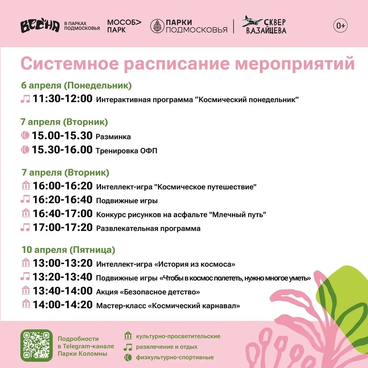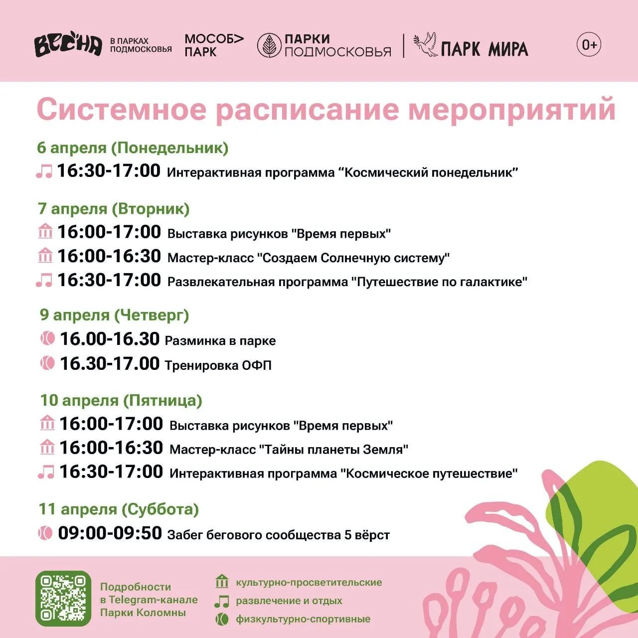 Парки Городского округа Коломна приглашают жителей и гостей муниципалитета активно, весело и с пользой провести время на свежем воздухе. На этой неделе в парках вновь запланировано множество интересных мероприятий, в том числе, посвященных Дню космонавтики.
