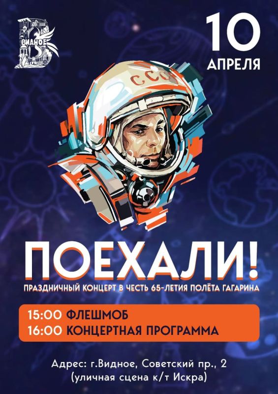10 апреля в 15:00 на площади кинотеатра «Искра» в Видном пройдут молодежный флешмоб, посвященный 65-летию первого полета в космос и праздничная концертная программа «Поехали!».