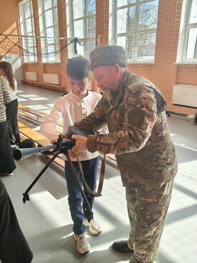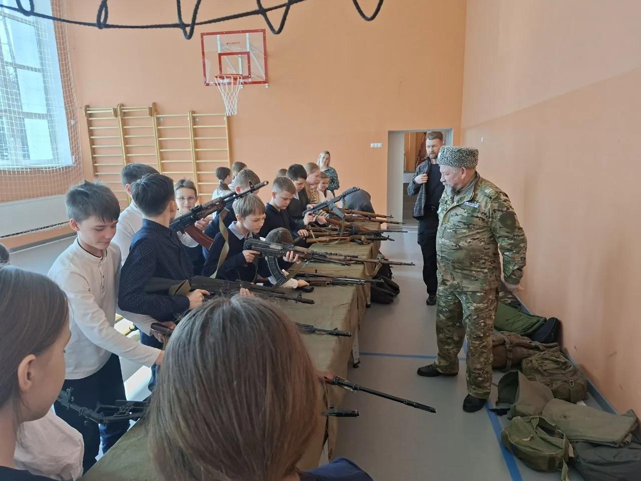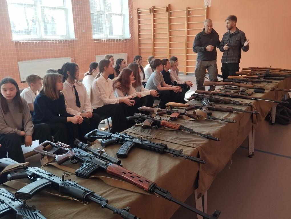 Школьникам рассказали об истории создания и технических особенностях винтовки Мосина (трёхлинейки), пистолета-пулемёта Шпагина, пистолета-пулемёта Судаева, самозарядной винтовки Токарева, ручного пулемёта Дегтярёва, а также пистолетов ТТ разных лет выпуска.