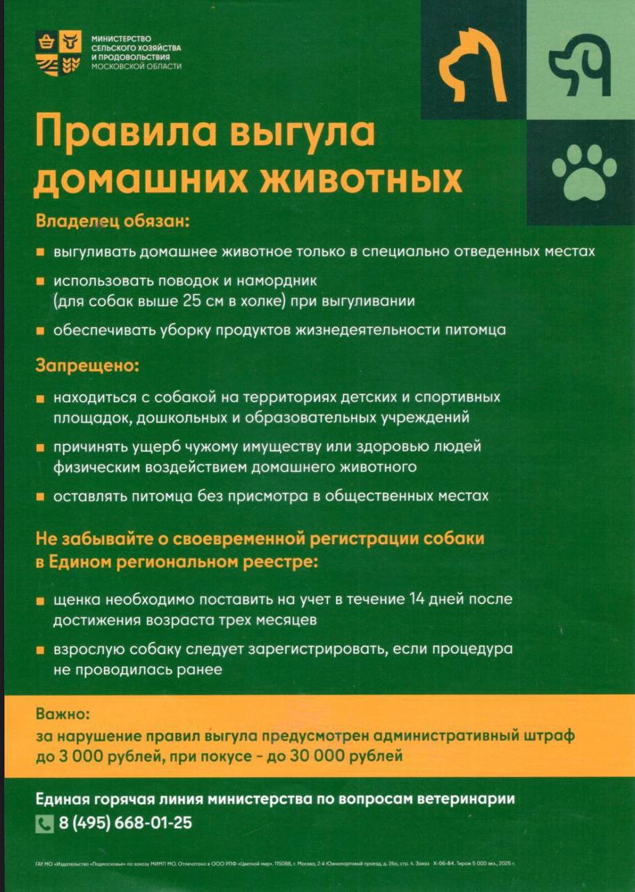 Министерство сельского хозяйства и продовольствия Московской области напоминает о правилах выгула домашних животных.