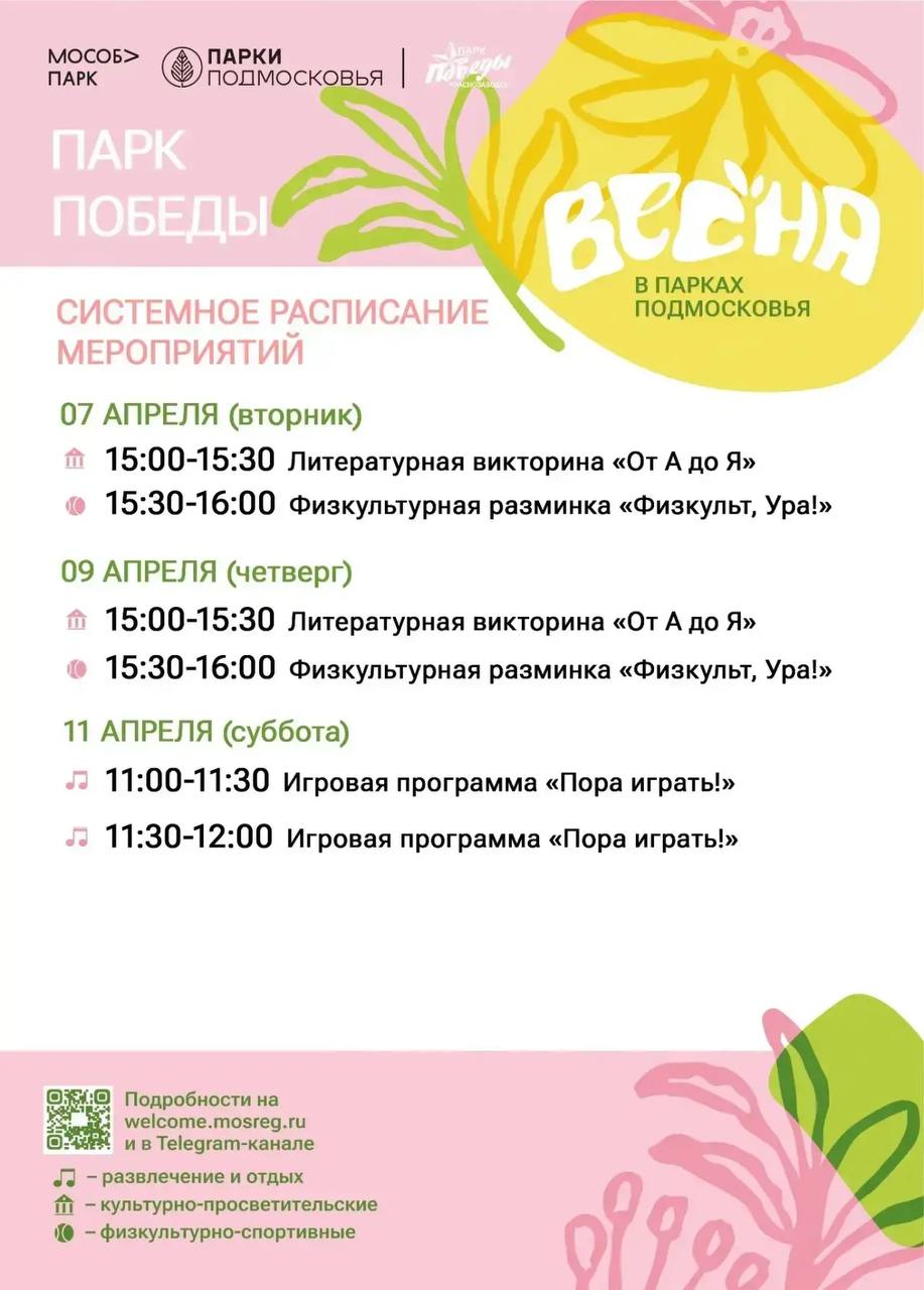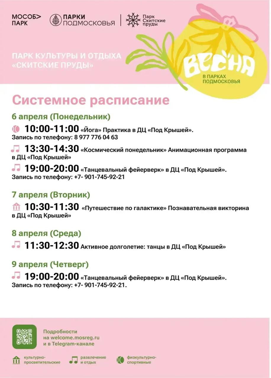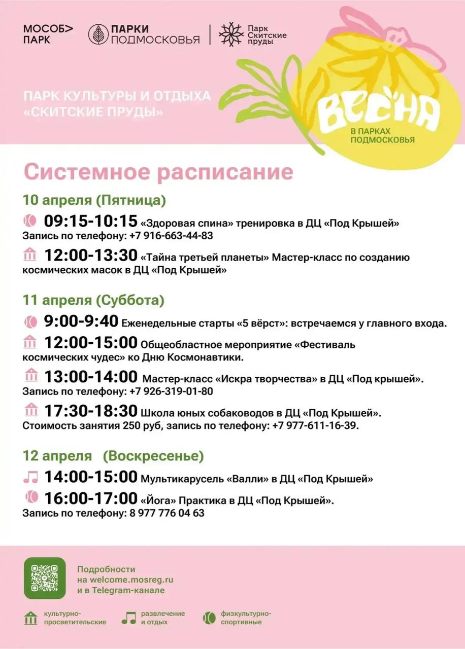 В парке «Скитские пруды» пройдет «Танцевальный фейерверк», познавательная викторина «Путешествие по галактике», танцы от клуба «Активное долголетие», тренировка «Здоровая спина», мастер-класс «Искра творчества», а также мероприятие «Фестиваль космических чудес» ко Дню космонавтики.