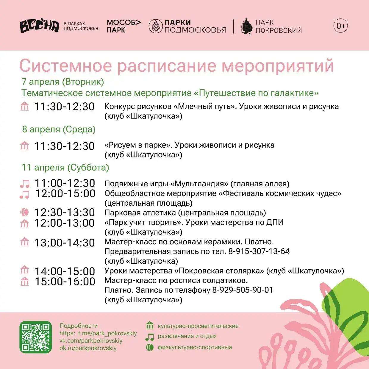 В парке «Покровский» г. Хотьково пройдет конкурс рисунков «Млечный путь», подвижные игры «Мультландия», парковая атлетика, уроки мастерства «Покровская столярка», общеобластное мероприятие «Фестиваль космических чудес», уроки живописи и рисунка «Рисуем в парке».