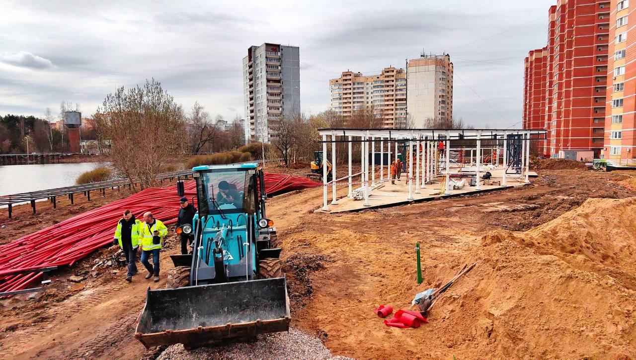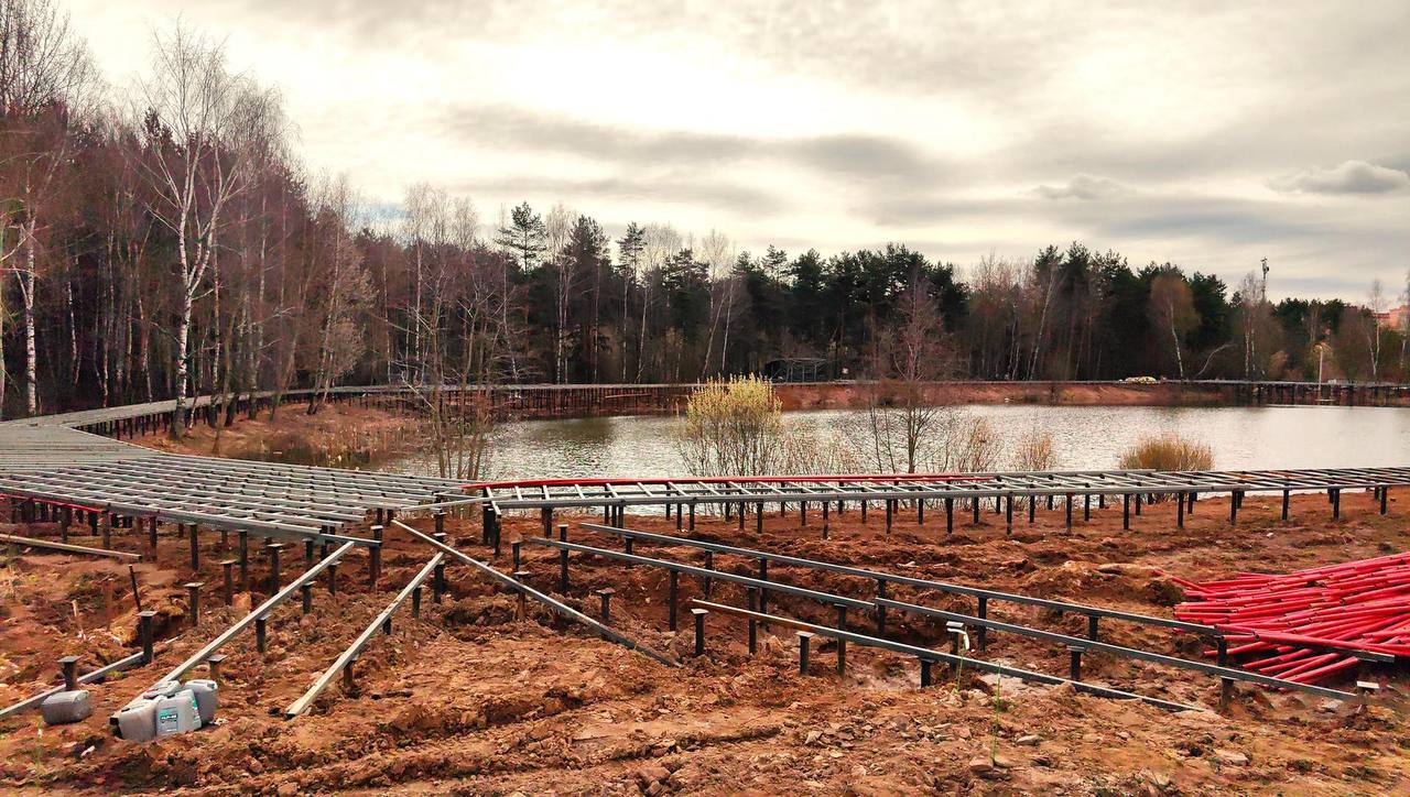 Более 35 гектаров преобразятся в современное пространство для отдыха всей семьёй. Работы идут полным ходом: специалисты монтируют деревянные настилы, прокладывают кабель для опор освещения, готовят каркас для будущего павильона.