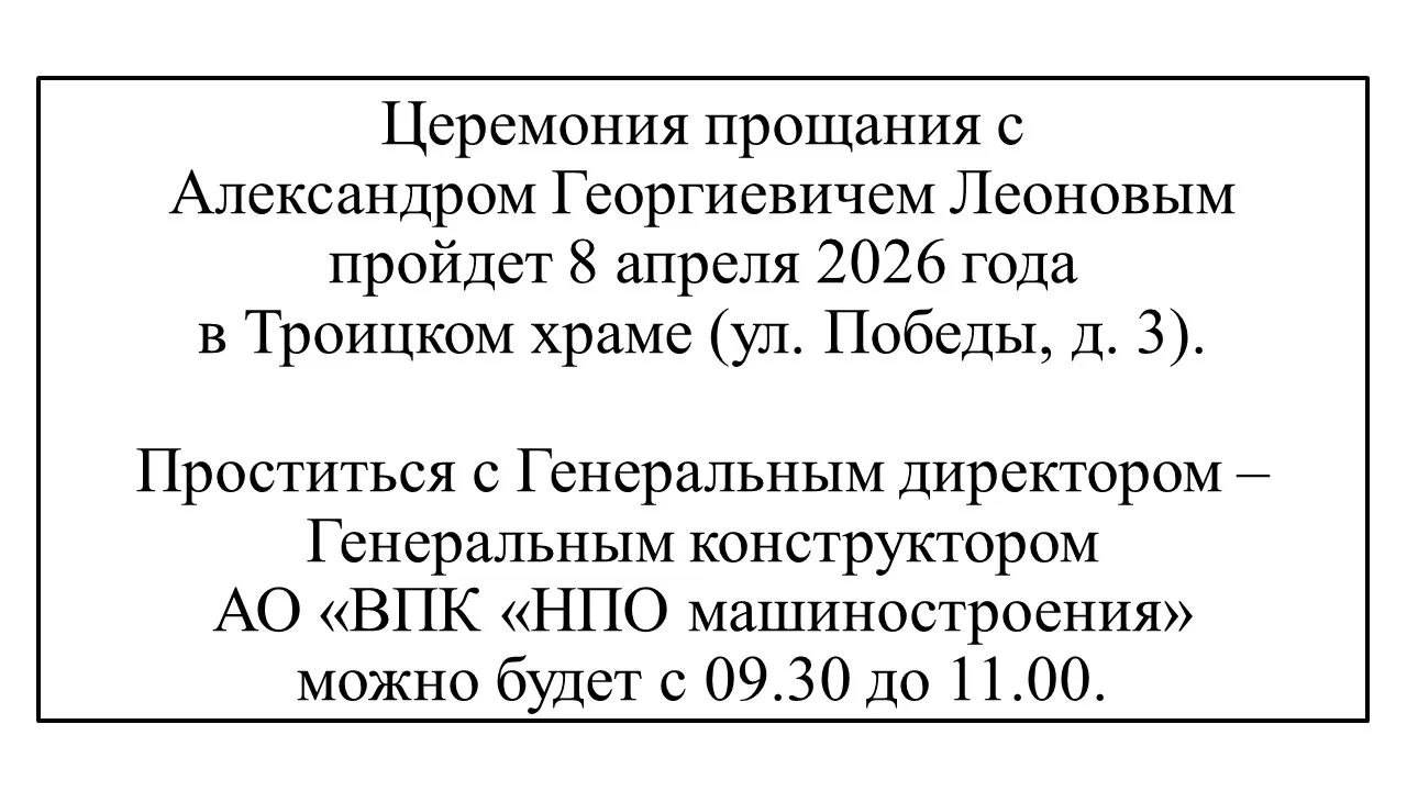 Уважаемые жители Реутова. Гражданская панихида и прощание с Генеральным директором – Генеральным конструктором АО «ВПК «НПО машиностроения» Александром Георгиевичем Леоновым состоятся в среду, 8 апреля, с 9.30 до 11.00 в...